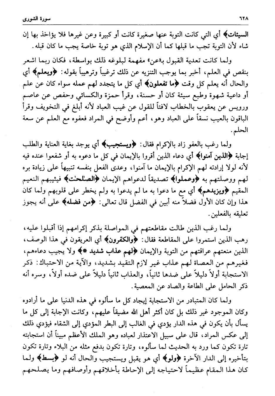 ولما كان المتبادر من الاستجابة إيجاد كل ما سألوه في هذه الدنيا على ما أرادوه وكان الموجود غير ذلك بل كلن أكثر أهل الله مضيقاً عليهم ، وكانت الإجابة إلى كل ما يسأل بأن يكون في هذه الدار يؤدي في الغالب إلى البطر المؤدي إلى الشقاء فيؤدي ذلك إلى عكس المراد ، قال على سبيل الاعتذار لعباده وهو الملك الأعظم مبيناً أن استجابته تارة تكون كما ورد به الحديث لما سألوه ، وتارة تكون بدفع مثله من البلاء وتارة تكون بتأخيره إلى الدار الآخرة ) ولو ) أي هو يقبل ويستجيب والحال أنه لو ) بسط ( ولما كان هذا المقان عظيماً لاحتياجه إلى الإحاطة بأخلاقهم وأوصافهم وما يصلحهم
