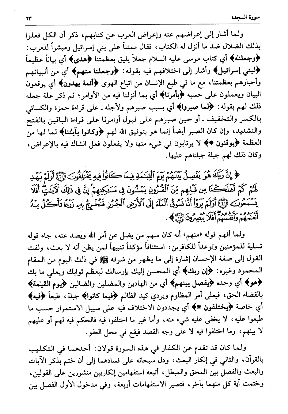 ) إِنَّ رَبَّكَ هُوَ يَفْصِلُ بَيْنَهُمْ يَوْمَ الْقَيَامَةِ فِيمَا كَانُواْ فِيهِ يَخْتَلِفُونَ أَوَلَمْ يَهْدِ لَهُمْ كَمْ أَهْلَكْنَا مِن قَبْلِهِمْ مِّنَ الْقُرُونِ يَمْشُونَ فِي مَسَاكِنِهِمْ إِنَّ فِي ذَلِكَ لآيَاتٍ أَفَلاَ يَسْمَعُونَ أَوَلَمْ يَرَوْاْ أَنَّا نَسُوقُ الْمَآءَ إِلَى الأَرْضِ الْجُرُزِ فَنُخْرِجُ بِهِ زَرْعاً تَأْكُلُ مِنْهُ أَنْعَامُهُمْ وَأَنفُسُهُمْ أَفَلاَ يُبْصِرُونَ ( ( )