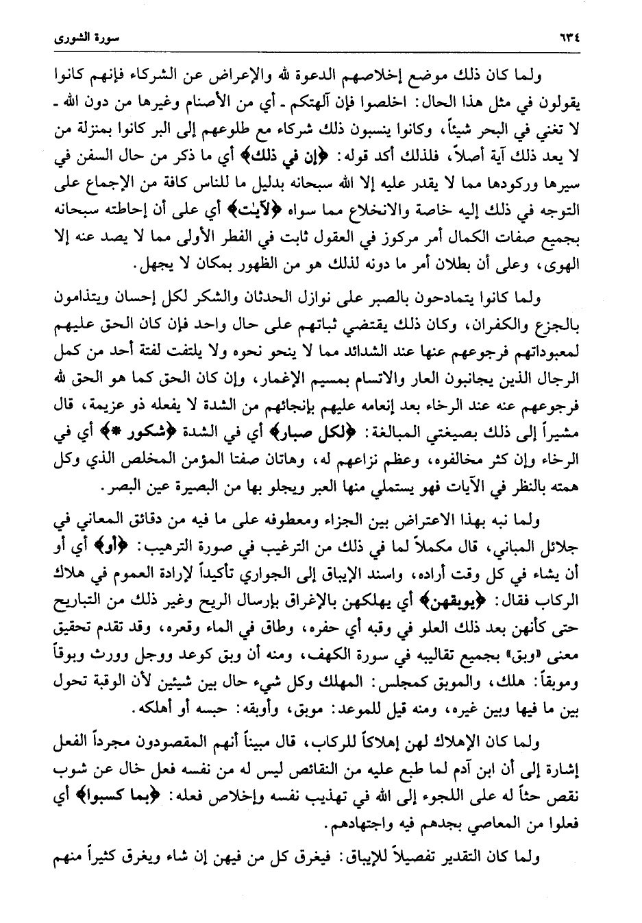 ولما كان ذلك موضع إخلاصهم الدعوة لله والإعراض عن الشركاء فإنهم كانوا يقولون في مثل هذا الحال : اخلصوا فإن آلهتكم - أي من الأصنام وغيرها من دون الله - لا تغني في البحر شيئاً ، وكانوا ينسبون ذلك شركاء مع طلوعهم إلى البر كانوا بمنزلة من لا يعد ذلك آية أصلاً ، فلذلك أكد قوله : ( إن في ذلك ) أي ما ذكر من حال السفن في سيرها وركودها مما لا يقدر عليه إلا الله سبحانه بدليل ما للنا سكافة من الإجماع على التوجه في ذلك إليه خاصة والانخلاع مما سواه ) لآيات ) أي على أن إحاطته سبحانه بجميع صفات الكمال أمر مركوز في العقول ثابت في الفطر الأولى مما لا يصد عنه إلا الهوى ، وعلى أن بطلان أمر ما دونه لذلك هو من الظهور بمكان لا يجهل .