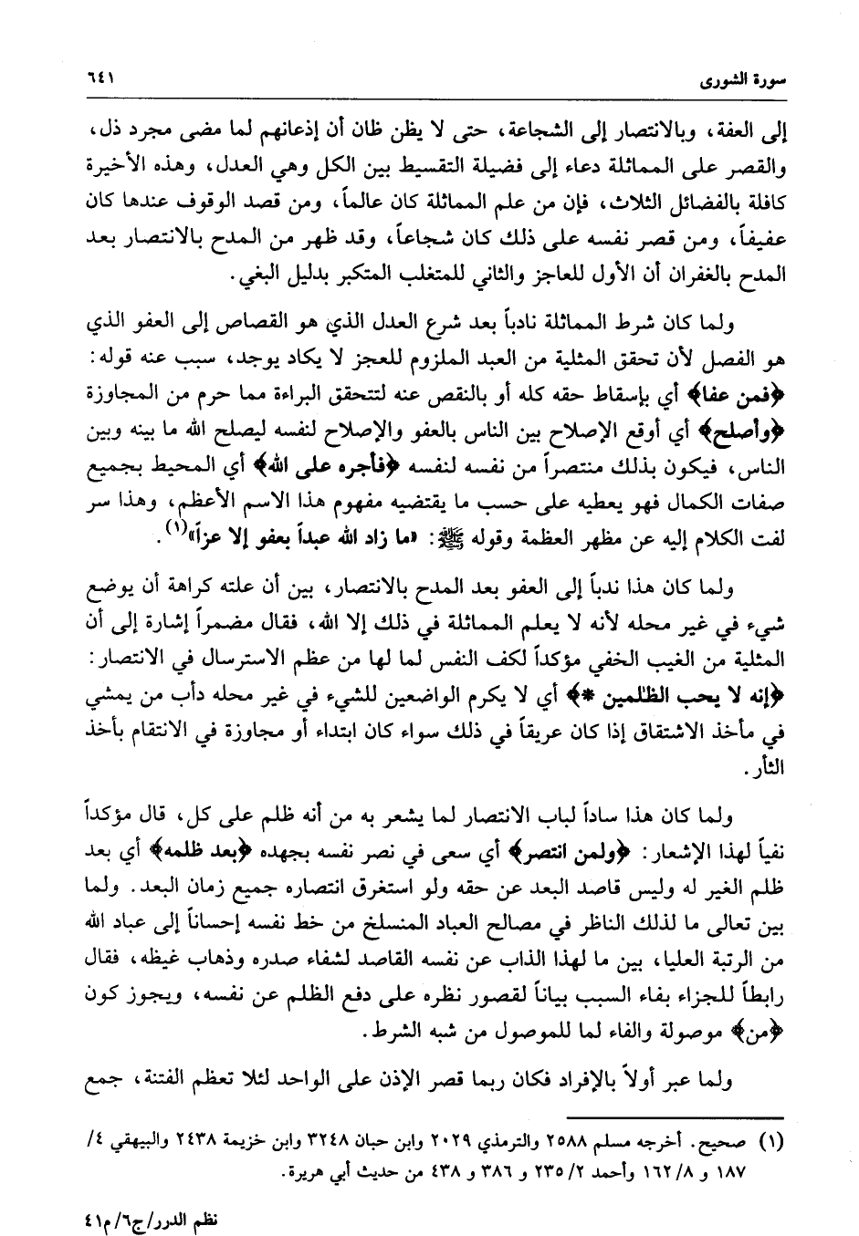 إلى العفة ، وبالانتصار إلى الشجاعة ، حتى لا يظن ظان أن إذعانهم لما مضى مجرد ذل ، والقصر على المماثلة دعاء إلى فضيلة التقسيط بين الكل وهي العدل ، وهذه الأخيرة كافلة بالفضائل الثلاث ، فإن من علم المماثلة كان عالماً ، ومن قصد الوقوف عندها كان عفيفاً ، ومن قصر نفسه على ذلك كان شجاعاً ، وقد ظهر من المدح بالانتصار بعد المدح بالغفران أن الأول للعاجز والثاني للمتغلب المتكبر بدليل البغي .