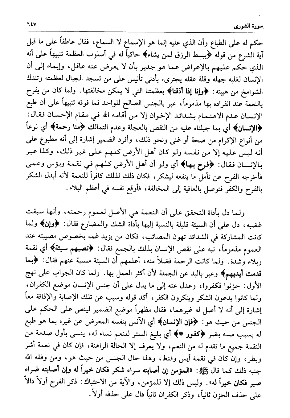 وليس ذلك إلا المؤمن ، والآية من الاحتباك : قكر الفرح أولاً دالاً على الحزن ثانياً ، وذكر الكفران ثانياً دال على حذفه أولاً .
