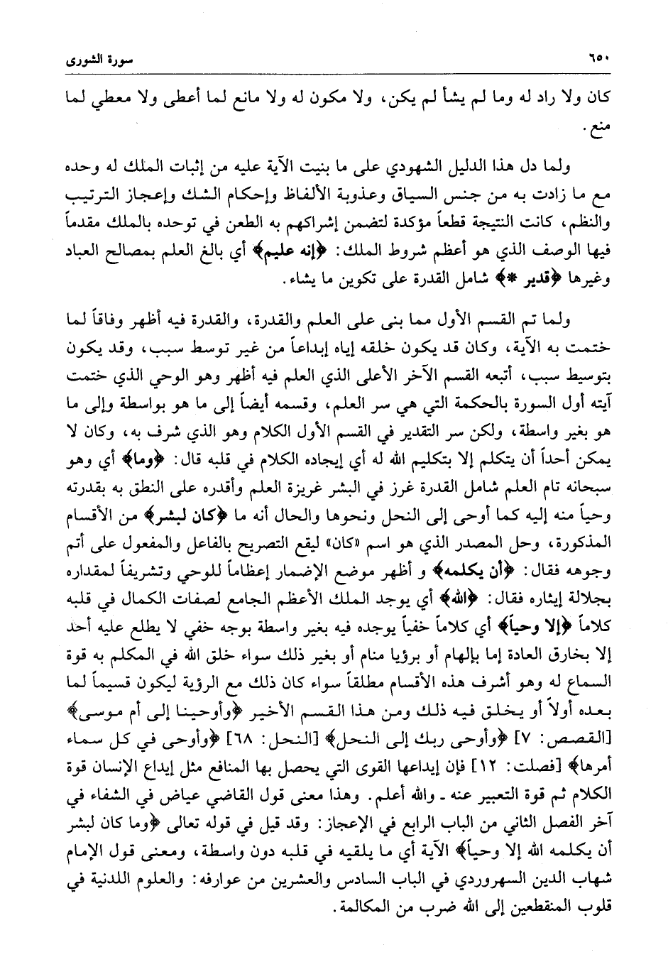 ولما تم القسم الأول مما بنى على العلم والقدرة ، والقدرة فيه أظهر وفاقاً لما ختمت به الآية ، وكان قد يكون خلقه إياه إبداعاً من غير توسط سبب ، وقد يكون بتوسيط سبب ، أتبعه القسم الآخر الأعلى الذي العلم فيه أظهر وهو الوحي الذي ختمت آيته أول السورة بالحكمة التي هي سر التقدير في القسم الأول الكلام في قلبه قال : ( وما ) أي وهو سبحانه تام العلم شامل القدرة غرز في البشر غريزة العلم وأقدره على النطق به بقدرته وحياً منه إليه كما أوحى إلى النحل ونحوها والحال أنه ما ) كان لبشر ( من الأقسام المذكورة ، وحل المصدر الذي هو اسم ( كان ) ليقع التصريح بالفاعل والمفعول على أتم وجوهه فقال : ( أن يكمله ( وأظهر موضع الإضمار إعظاماً للوحي وتشريفاً لمقداره بجلالة إيثاره قفال : ( الله ) أي يوجد الملك الأعظم الجامع لصفات الكمال في قلبه كلاماً ) إلا وحياً ) أي كلاماً خفياً يوجده فيه بغير واسطة بوجه خفي لا يطلع عليه أحد إلا بخارق العادة إما بإلبهام أو برؤيا منام أو بغير ذلك سواء كان ذلك مع الرؤية ليكون قسماً لما بعده أولاً أو يخلق فيه ذلك ومن هذا القسم الأخير