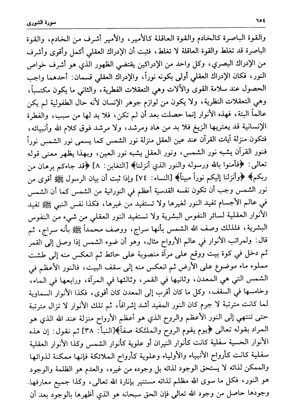 والقوة الباصرة كالخدم والقوة العاقلة كالامبير ، والامير أشرف من الخادم ، والقوة الباصرة قد تغلط والقوة العاقلة لا تغلط ، إن الإدراك العقلي أكمل وأقوى وأشرف من الإدراك البصري ، وكل واحد من الإدراكين يقتضي الظهور الذي هو أشرف خواص النور ، فكان الإدراك العقلي أولى بكونه نوراً ، والإدراك العقلي قسمان : أحدهما واجب الحصول عند سلامة القوى والالات وهي التعقلات الفطرية ، والثاني ما يكون مكتسباً ، وهي التعقلات النظرية ، ولا يكون منت لوازم جوهر الإنسان لأنه حال الطفولية لم يكن عالماً البتة ، فهذه الأنورا إنما حصلت بعد أن لم تكن فلا بد لها من سبب ، والفطرة الإنسانية قد يعتريها الزيغ فلا بد مكن هاد ومرشد ، ولا مرشد فوق كلام الله وأنبيائه ، فتكون منزلة ىيات القرآن عند عين العقل منزلة نور الشمس ونور العقل يشبه نور العين ، وبهذا يظهر معنى قوله تعالى :
