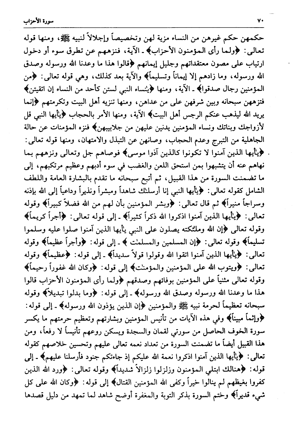 حكمهن حكم غيرهن من النساء مزية لهن وتخصيصاً وإجلالاً لنبيه ( صلى الله عليه وسلم ) ، ومنها قوله تعالى : ( ولما رأى المؤمنون الأحزاب ( - الآية ، فنزههم عن تطرق سوء أو دخول ارتياب على مصون معتقداتهم وجليل إيمانهم ) قالوا هذا ما وعدنا الله ورسوله وصدق الله ورسوله ، وما زادهم إلا إيماناً وتسليماً ( والآية بعد ذلك ، وهي قوله تعالى : ( من المؤمنين رجال صدقوا ( - الآية ، ومنها ) يا نساء النبي لستن كأحد من النساء إن اتقيتن ( فتزههن سبحانه وبين شرفهن على مد عداهن ، ومنها تنزيه أهل البيت وتكرمتهم ) إنما يريد الله ليذهب عنكم الرجس أهل البيت ( الآية ، ومنها الأمر بالحجاب ) يا أيها النبي قل لأزواجك وبناتك ونساء المؤمنين يدنين عليهن من جلابيبهن ( فنزه المؤمنات عن حالة الجاهلية من التبرج وعدم الحجاب ، وصانهن عن التبذل والامتهان ، ومنها قوله تعالى : ( يا أيها الذين آمنوا لا تكونوا كالذين آذوا موسى ( فوصاهم جل وتعالى ونزهم بما نهاهم عنه أن يتشبهوا بمن استحق اللعن والغضب في سوء أدبهم وعظيم مرتكبهم ، إلى ما تضمنت السورة من هذا القبيل ، ثم أتبع سبحانه ما تقدم بالبشارة العامة واللطف الشامل كقوله تعالى : ( يا أيها النبي إنا أرسلناك شاهداً ومبشراً ونذيراً وداعياً إلى الله بإذنه وسراجاً منيراً ( ثم قال تعالى : ( وبشر المؤمنين بأن لهم من الله فضلاً كبيراً ( وقوله تعالى : ( يا أيها الذين آمنوا اذكروا كثيراً ( - إلى قوله تعالى : ( أجراً كريماً ( وقوله تعالى ) إن الله وملائكته يصلون على النبي يا أيها الذين آمنوا صلوا عليه وسلموا تسليماً ( وقوله تعالى : ( إن المسلمين والمسلمات ( - إلى قوله : ( وأجراً عظيماً ( وقوله تعالى : ( يا أيها الذين آمنوا اتقوا الله وقولوا قولاً سديداً ( - إلى قوله : ( عظيماً ( وقوله تعالى : ( ويتوب الله على المؤمنين والمؤمنات ( إلى قوله : ( وكان الله غفوراً رحيماً ( وقوله تعالى مثنياً على المؤمنين بوفائهم وصدقهم ) ولما رأي المؤمنون الأحزاب قالوا هذا ما وعدنا الله ورسوله وصدق الله ورسوله ( - إلى قوله : ( وما بدلوا تبديلاً ( وقوله : ( وإثماً مبيناً ( وفي هذه الآيات من تأنيس المؤمنين وبشارتهم وتعظيم حرمتهم ما يكسر هذا القبيل أيضاً ما تضمنت السورة من تعداد نعمه تعالى عليهم وتحسين خلاصهم كقوله تعالى : ( يا أيها الذين آمنوا اذكروا نعمة الله عليكم إذ جاءتكم جنود فأرسلنا عليهم ( - إلى قوله : ( هنالك ابتلي المؤمنون وزلزلوا زلزالاً شديداً ( وقوله تعالى : ( ورد الله الذين كفروا بغيظهم لم ينالوا خيراً وكفى الله المؤمنين القتال ( إلى قوله : ( وكان الله على كل شيء قديراً ( وختم السورة بذكر التوبة والمغفرة أوضح شاهد لما تمهد من دليل قصدها