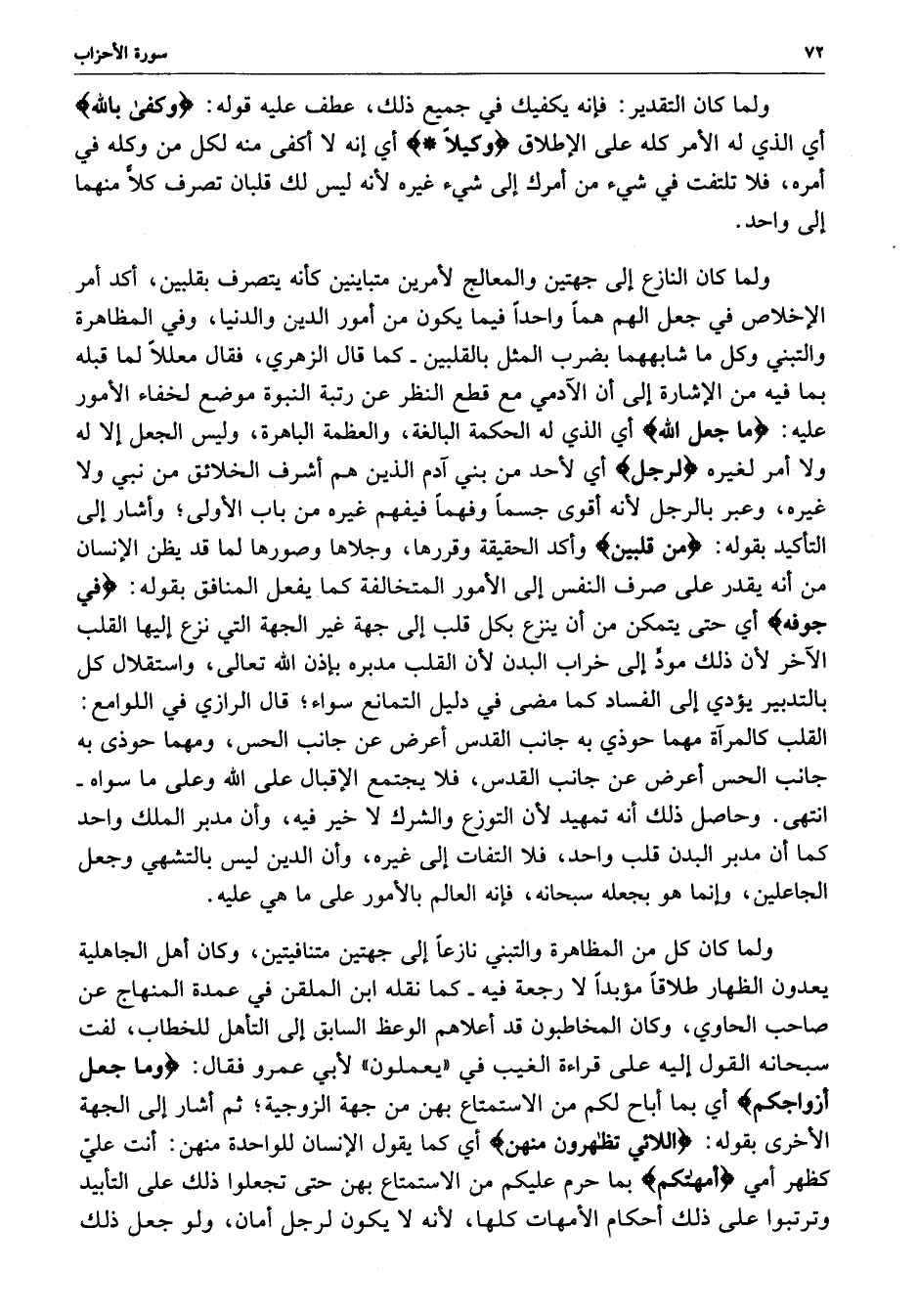 ولما كان النازع إلى جهتين والمعالج لأمرين متباينين كأنه يتصرف بقلبين ، أكد أمر الإخلاص في جعل الهم هماً واحداً فيما يكون من أمور الدين والدنيا ، وفي المظاهرة والتبني وكل ما شابهها بضرب المثل بالقلبين - كما قال الزهري ، فقال معللاً لما قبله بما فيه من الإشارة إلى أن الآدمي مع قطع النظر عن رتبة النبوة موضع لخفاء الأمور عليه : ( ما جعل الله ) أي الذي له الحكمة البالغة ، والعظمة الباهرة ، وليس الجعل إلا له ولا أمر لغيره ) لرجل ) أي لأحد من بني آدم الذين هم أشرف الخلائق من نبي ولا غيره ، وعبر الرجل لأنه أقوى جسماً وفهماً فيفهم غيره من باب الأولى ؛ وأشار إلى التأكيد بقوله : ( من قلبين ( وأكد الحقيقة وقررها ، وجلاها وصورها لما قد يظن الإنسان من أنه يقدر على صرف النفس إلى الأمور المتخالفة كما يفعل المنافق ، بقوله : ( في جوفه ) أي حتى يتمكن من أن ينزع بكل قلب إلى جهة غير الجهة التي نزع إليها القلب الآخر لأن ذلك مودِّ إلى خراب البدن لأن القلب مدبره بإذن الله تعالى ، واستقلال كل بالتدبير يؤدي إلى الفساد كما مضى في دليل التمانع سواء ؛ قال الرازي في اللوامع : القلب كالمرآة مهما حوذي به جانب القدس أعرض عن جانب الحس ، ومهما حوذي به جانب الحس أعرض عن جانب القدس ، فلا يجتمع الإقبال على الله وعلى ما سواه - انتهى .