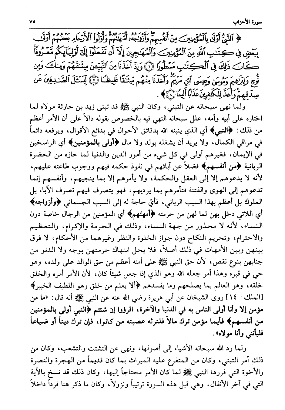 ) النَّبِيُّ أَوْلَى بِالْمُؤْمِنِينَ مِنْ أَنْفُسِهِمْ وَأَزْوَاجُهُ أُمَّهَاتُهُمْ وَأُوْلُو الأَرْحَامِ بَعْضُهُمْ أَوْلَى بِبَعْضٍ فِي كِتَابِ اللَّهِ مِنَ الْمُؤْمِنِينَ وَالْمُهَاجِرِينَ إِلاَّ أَن تَفْعَلُواْ إِلَى أَوْلِيَآئِكُمْ مَّعْرُوفاً كَانَ ذَلِكَ فِي الْكِتَابِ مَسْطُوراً وَإِذْ أَخَذْنَا مِنَ النَّبِيِّيْنَ مِيثَاقَهُمْ وَمِنْكَ وَمِن نُّوحٍ وَإِبْرَاهِيمَ وَمُوسَى وَعِيسَى ابْنِ مَرْيَمَ وَأَخَذْنَا مِنْهُمْ مِّيثَاقاً غَلِيظاً لِّيَسْأَلَ الصَّادِقِينَ عَن صِدْقِهِمْ وَأَعَدَّ لِلْكَافِرِينَ عَذَاباً أَلِيماً ( ( )