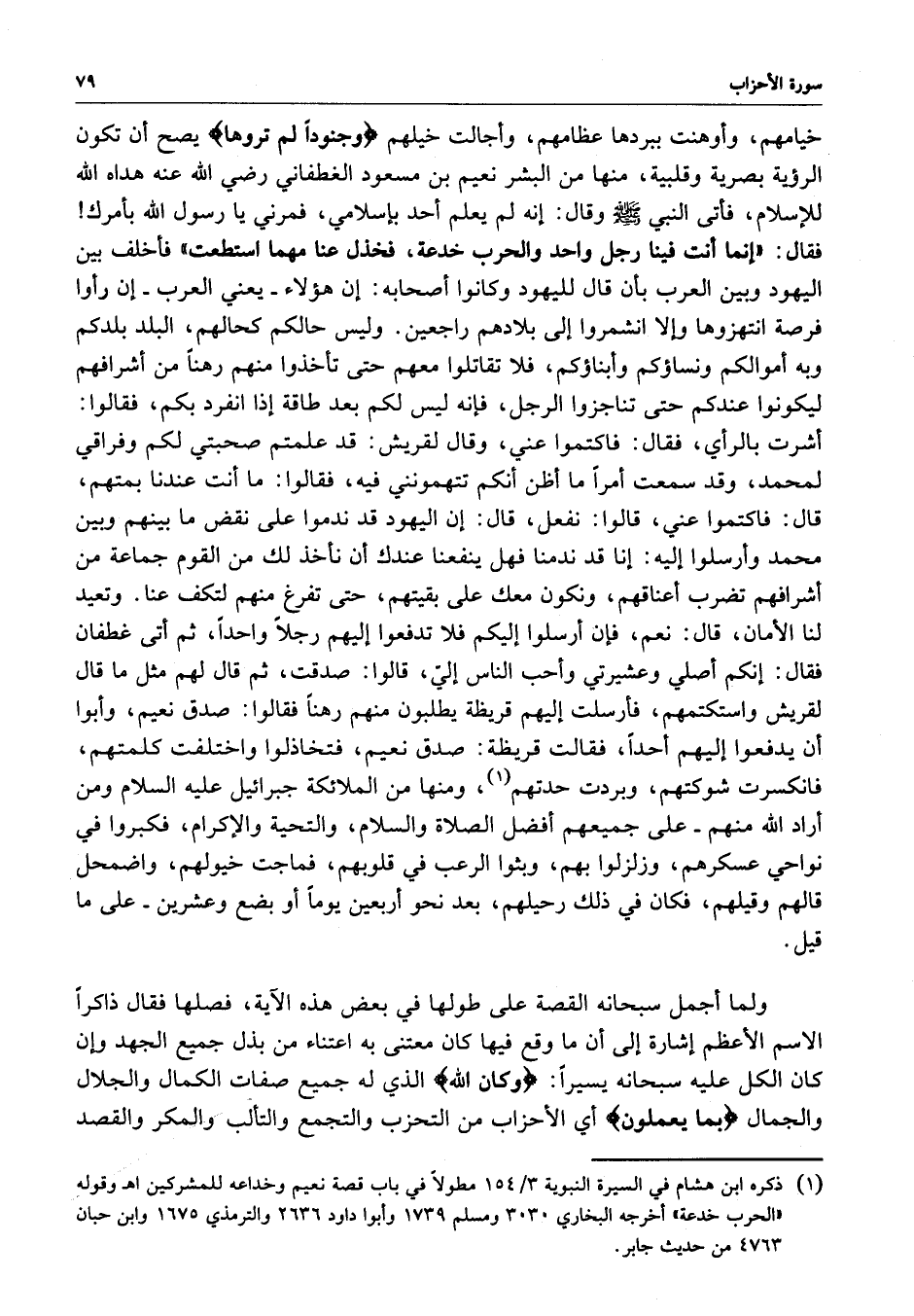 وتعيد لنا الأمان ، قال : نعم ، فإن أرسلوا إليكم فى تدفعوا إليهم رجلاً واحداً ، ثم أتى غطفان فقال : إنكم أصلي وعشيرتي وأحب الناس إليّ ، قالوا : صدقت ، ثم قال لهم مثل ما قال لقريش واستكتمهم ، فأرسلت إليهم قريظة يطلبون منهم رهناً فقالوا : صدق نعيم ، وأبوا أن يدفعوا إليهم أحداً ، فقالت قريظة : صدق نعيم ، فتخاذلوا واختلفت كلمتهم ، فانكسرت شوكتهم ، وبدرت حدتهم ، ومنها من الملائكة جبرائيل عليه السلام ومن أراد الله منهم - على جميعهم أفضل الصلاة والسلام ، والتحية والإكرام ، فكبروا في نواحي عسكرهم ، وزلزلوا بهم ، وبثوا الرعب في قلوبهم ، فماجت خيولهم ، واضمحل قالهم وقيلهم ، فكان في ذلك رحيلهم ، بعد نحو أربعين يوماً أو بضع وعشرين - على ما قيل .