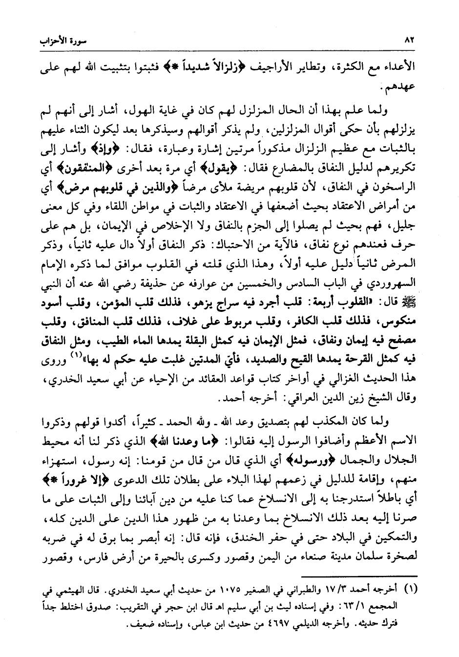 ولما علم بهذا أن الحال المزلزل لهم كان في غاية الهول ، أشار إلى أنهم لم يزلزلهم بأن حكى أقوال المزلزلين ، ولم يذكر أقوالهم وسيذكرها بعد ليكون الثناء عليهم بالثبات مع عظيم الزالزال مذكوراً مرتين إشارة وعبارة ، فقال : ( وإذ ( وأشار إلى تكريرهم لدليل النفاق بالمضارع فقال : ( يقول ) أي مرة بعد أخرى ) المنافقون ) أي الراسخون في النفاق ، لأن قلوبهم مريضة ملائ مرضاً ) والذين في قلوبهم مرض ) أي من أمراض الإعتقاد بحيث أضعفها في الإعتقاد والثبات في مواطن اللقاء وفي كل معنى جليل ، فهم بحيث لم يصلوا إلى الجزم بالنفاق ولا الإخلاص في الإيمان ، بل هم على حرف فعندهم نوع النفاق ، فالآية من الاحتباك : ذكر النفاق أولاً دال عليه ثانياً ، وذكر المرض ثانياً دليل عليه أولاً ، وهذا الذي قلته في القلوب موافق لما ذكره الإمام السهرودي في الباب السادس والخمسين من عوارفه عن حذيفة رضي الله عنه أن النبي ( صلى الله عليه وسلم ) قال : ( القلوب أربعة : قلب أجرد فيه سراج يزهو ، فذلك قلب المؤمن ، وقلب أسود منكوس ، فذلك قلب الكافر ، وقلب مربوط على غلاف ، فذلك قلب المنافق ، وقلب مصفح فيه إيمان ونفاق ، فمثل الإيمان فيه كمثل البقلة يمدها الماء الطيب ، ومثل النفاق فيه كمثل القرحة يمدها القيح والصديد ، فأيّ المدتين غلبت عليه حكم له بها ) وروى هذا الحديث الغزالي في أواخر كتاب قواعد العقائد من الإحياء عن أبي سعيد الخدري ، وقا الشيخ زين الدين العراقي : أخرجه أحمد .