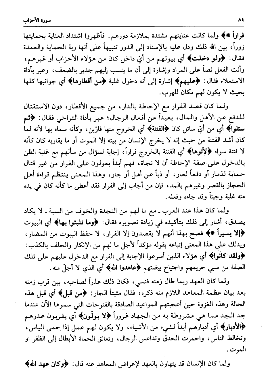 ولما كان هذا عند العرب - مع ما لهم من النجدة والخوف من السبة - لا يكاد يصدق ، أشار إلى ذلك بتأكيده في زيادة تصويره فقال : ( وما تلبثوا بها ) أي البيوت ) إلا يسيرا ( فصح بهذا أنهم لا يقصدون إلا الفرار ، لا حفظ البيوت من المضار ، ويدلك على هذا المعنى إتباعه بقوله مؤكداً لأجل ما لهم من الإنكار والحلف بالكذب : ( ولقد كانوا ) أي هؤلاء الذين أسرعوا الإجابة إلى الفرار مع الدخول عليهم على تلك الصفة من سبي حريمهم واجتياح بيضتهم ) عاهدوا الله ) أي الذي أجلّ منه .