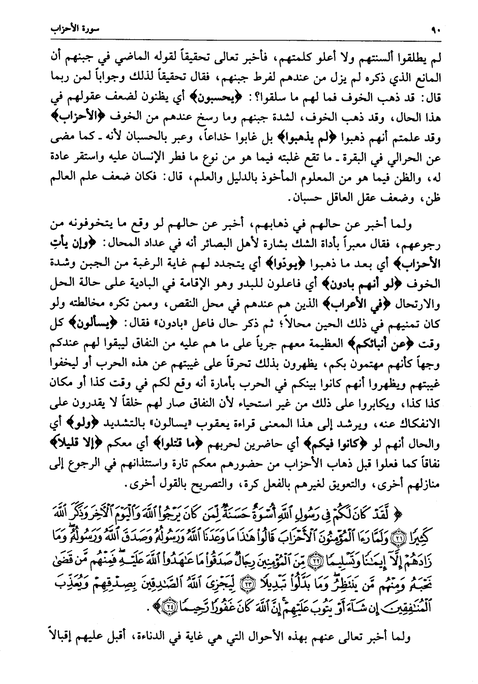 ) لَّقَدْ كَانَ لَكُمْ فِي رَسُولِ اللَّهِ أُسْوَةٌ حَسَنَةٌ لِّمَن كَانَ يَرْجُو اللَّهَ وَالْيَوْمَ الآخِرَ وَذَكَرَ اللَّهَ كَثِيراً وَلَمَّا رَأَى الْمُؤْمِنُونَ الأَحْزَابَ قَالُواْ هَذَا مَا وَعَدَنَا اللَّهُ وَرَسُولُهُ وَصَدَقَ اللَّهُ وَرَسُولُهُ وَمَا زَادَهُمْ إِلاَّ إِيمَاناً وَتَسْلِيماً مِّنَ الْمُؤْمِنِينَ رِجَالٌ صَدَقُواْ مَا عَاهَدُواْ اللَّهَ عَلَيْهِ فَمِنْهُمْ مَّن قَضَى نَحْبَهُ وَمِنْهُمْ مَّن يَنتَظِرُ وَمَا بَدَّلُواْ تَبْدِيلاً لِّيَجْزِيَ اللَّهُ الصَّادِقِينَ بِصِدْقِهِمْ وَيُعَذِّبَ الْمُنَافِقِينَ إِن شَآءَ أَوْ يَتُوبَ عَلَيْهِمْ إِنَّ اللَّهَ كَانَ غَفُوراً رَّحِيماً ( ( )