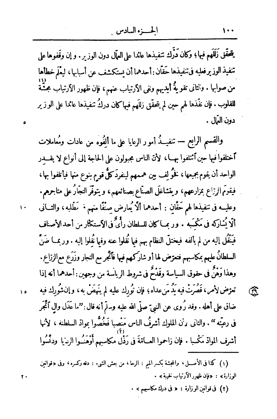 وعليه فى تنفيذها لهم حقّان: أحدهما ألّا يعارض صنفا منهم فى مطلبه، والثانى ألّا يشاركه فى مكسبه. وربما كان للسلطان رأى فى الاستكثار من أحد الأصناف فينقل إليه من لم يألفه فيختلّ النظام بهم فيما نقلوا عنه وفيما نقلوا إليه. وربما ضنّ السلطان عليهم بمكاسبهم فتعرّض لها أو شاركهم فيها فاتّجر مع التجار وزرع مع الزرّاع.
