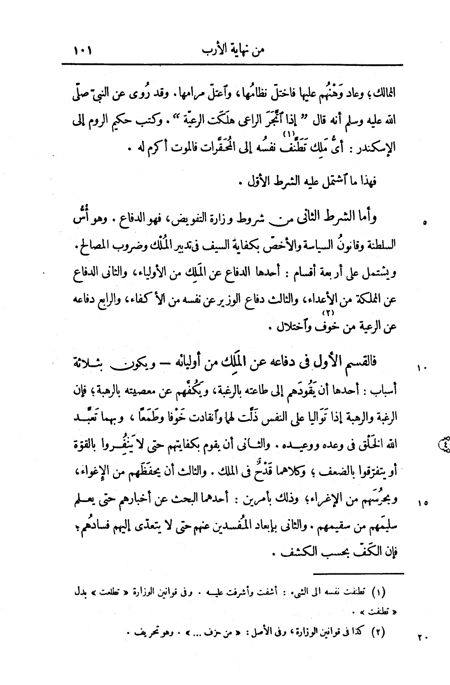 وأما الشرط الثانى من شروط وزارة التفويض، فهو الدفاع. وهو أسّ السلطنة وقانون السياسة والأخصّ بكفاية السيف فى تدبير الملك وضروب المصالح.