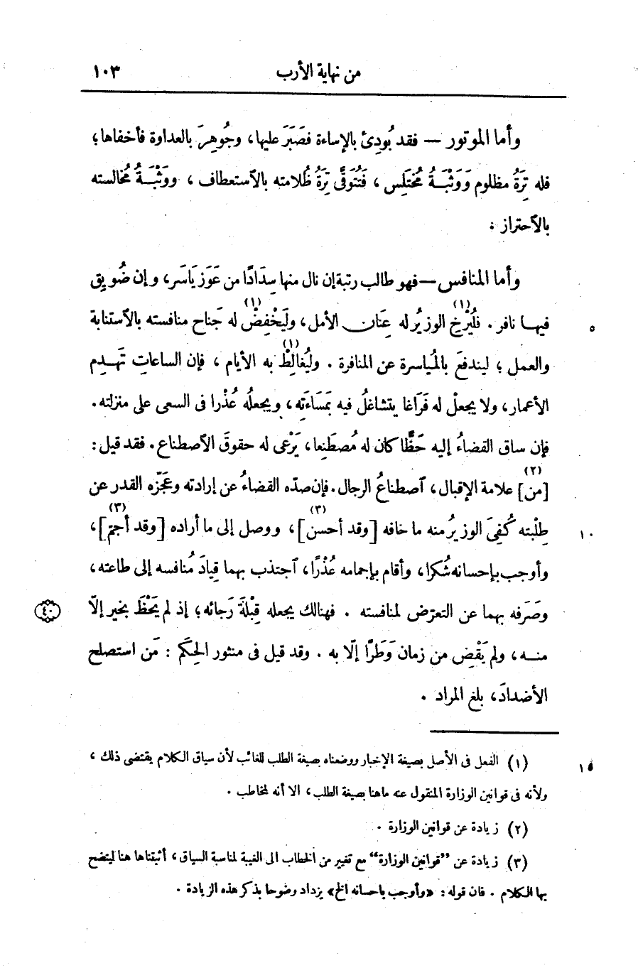وأما المنافس- فهو طالب رتبة إن نال منها سدادا من عوز ياسر، وإن ضويق فيها نافر. فليرخ [1] الوزير له عنان الأمل، وليخفض [2] له جناح منافسته بالاستنابة والعمل؛ ليندفع بالمياسرة عن المنافرة. وليغالط [3] به الأيام، فإن الساعات تهدم الأعمار، ولا يجعل له فراغا يتشاغل فيه بمساءته، ويجعله عذرا فى السعى على منزلته.