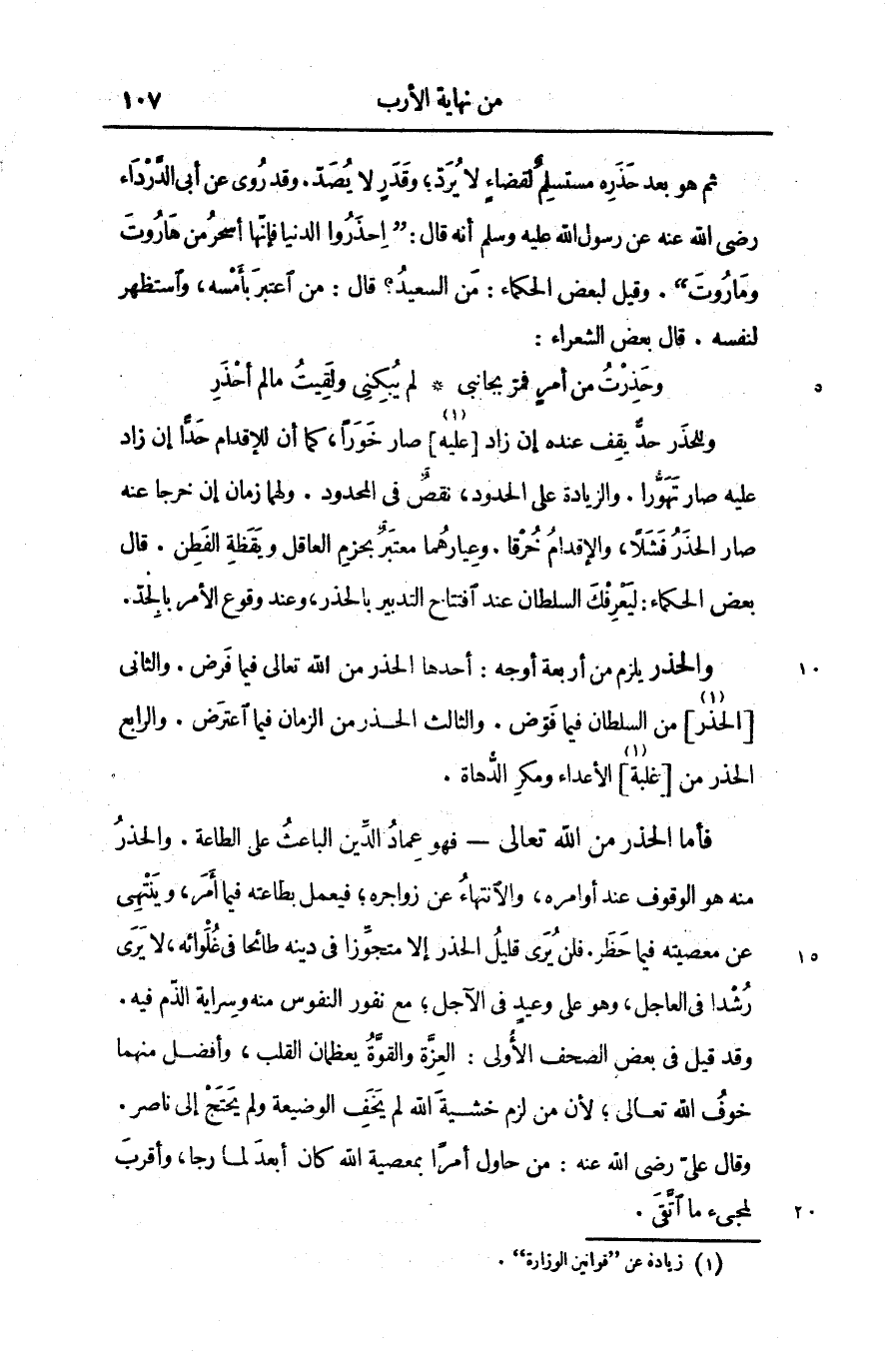 والحذر يلزم من أربعة أوجه: أحدها الحذر من الله تعالى فيما فرض. والثانى [الحذر [2]] من السلطان فيما فوّض. والثالث الحذر من الزمان فيما اعترض. والرابع الحذر من [غلبة [3]] الأعداء ومكر الدّهاة.