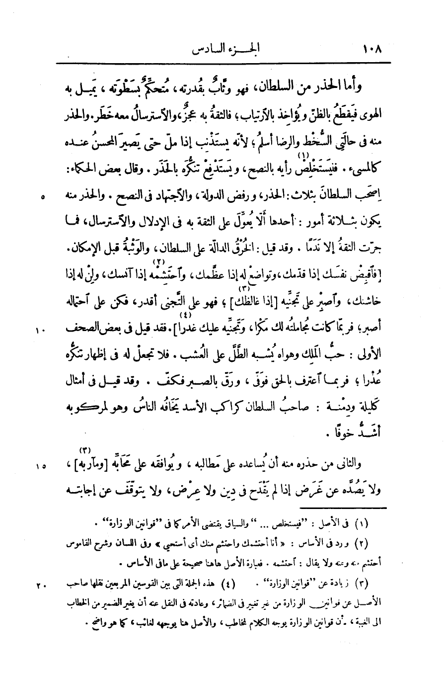 وأما الحذر من السلطان، فهو وثّاب بقدرته، متحكّم بسطوته، يميل به الهوى فيقطع بالظنّ ويؤاخذ بالارتياب؛ فالثقة به عجز، والاسترسال معه خطر. والحذر منه فى حالتى السّخط والرضا أسلم؛ لأنّه يستذنب إذا ملّ حتى يصير المحسن عنده كالمسىء. فليستخلص [1] رأيه بالنصح، ويستدفع تنكّره بالحذر. وقال بعض الحكماء: