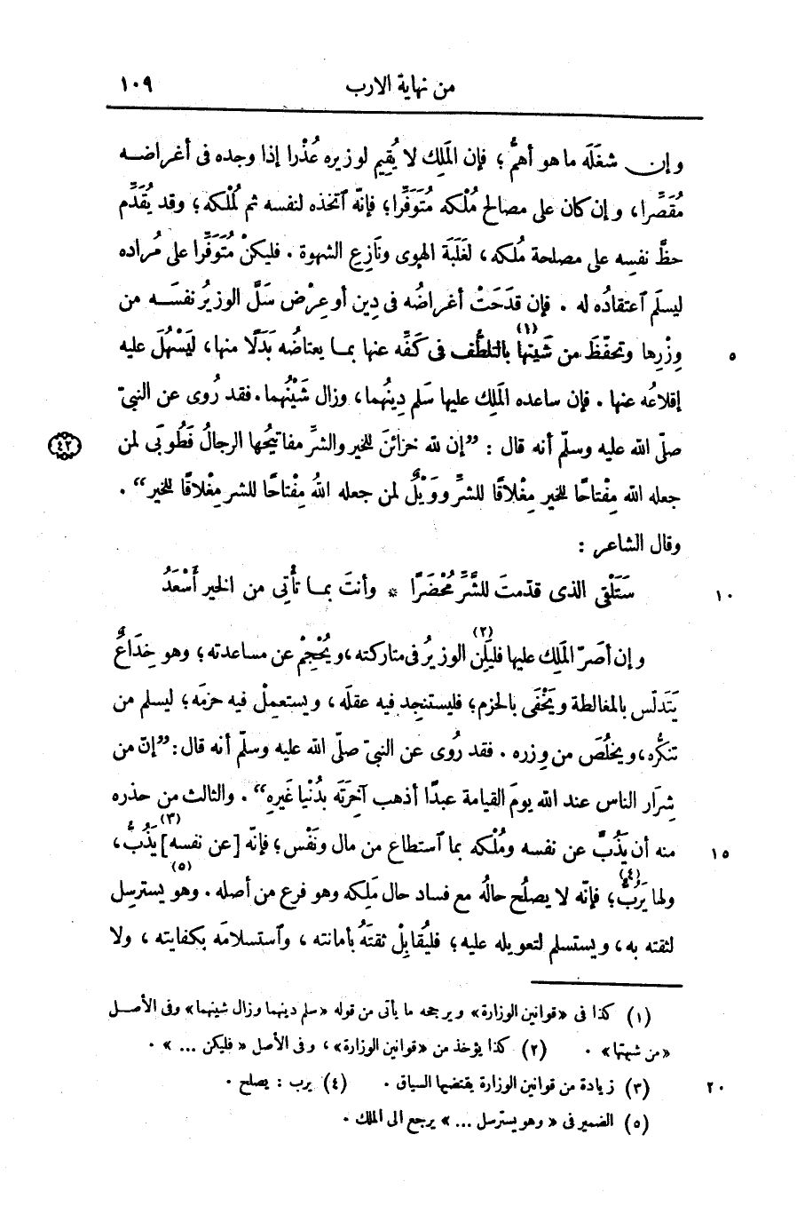 وإن شغله ما هو أهمّ؛ فإن الملك لا يقيم لوزيره عذرا إذا وجده فى أغراضه مقصّرا، وإن كان على مصالح ملكه متوفّرا؛ فإنّه اتخذه لنفسه ثم لملكه؛ وقد يقدّم حظّ نفسه على مصلحة ملكه، لغلبة الهوى ونازع الشهوة. فليكن متوفّرا على مراده ليسلم اعتقاده له. فإن قدحت أغراضه فى دين أو عرض سلّ الوزير نفسه من وزرها وتحفّظ من شينها [1] بالتلطّف فى كفّه عنها بما يعتاضه بدلا منها، ليسهل عليه إقلاعه عنها. فإن ساعده الملك عليها سلم دينهما، وزال شينهما.