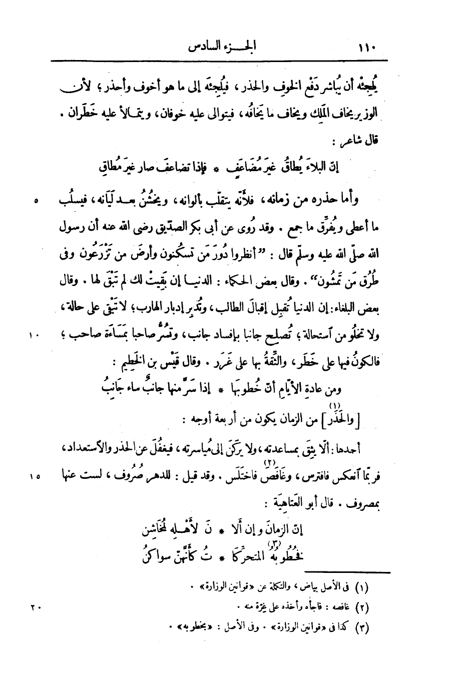 أحدها: ألّا يثق بمساعدته، ولا يركن إلى مياسرته، فيغفل عن الحذر والاستعداد، فربّما انعكس فافترس، وغافص [2] فاختلس. وقد قيل: للدهر صروف، لست عنها بمصروف. قال أبو العتاهية: