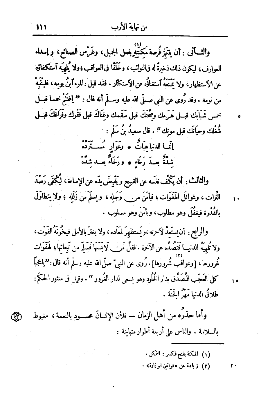 والثانى: أن ينتهز فرصة مكنته [1] بفعل الجميل، وغرس الصنائع، وإسداء العوارف؛ ليكون ذلك ذخيرة له فى النوائب، وخلفا فى العواقب؛ ولا يلهيه استكفاؤه عن الاستظهار، ولا يمنعه استغناؤه عن الاستكثار. فقد قيل: المرء ابن يومه، فلينتبه من نومه.