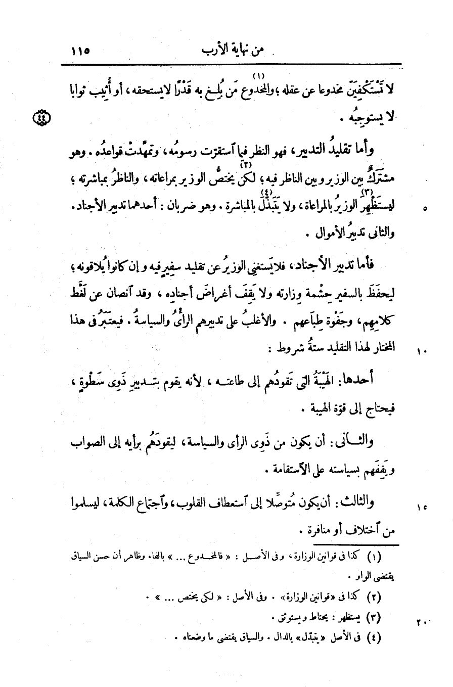 فأما تدبير الأجناد، فلا يستغنى الوزير عن تقليد سفير فيه وإن كانوا يلاقونه؛ ليحفظ بالسفير حشمة وزارته ولا يقف أغراض أجناده، وقد انصان عن لغط كلامهم، وجفوة طباعهم. والأغلب على تدبيرهم الرأى والسياسة. فيعتبر فى هذا المختار لهذا التقليد ستة شروط: