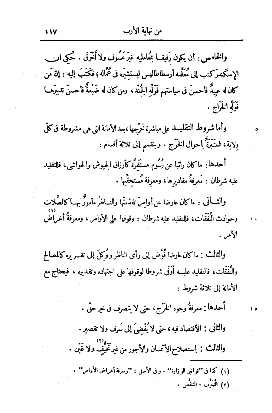 والثالث: ما كان عارضا فوّض إلى رأى الناظر ووكل إلى تقريره كالمصالح والنّفقات، فالتقليد عليه أوفى شروطا لوقوفها على اجتهاده وتقديره، فيحتاج مع الأمانة إلى ثلاثة شروط: