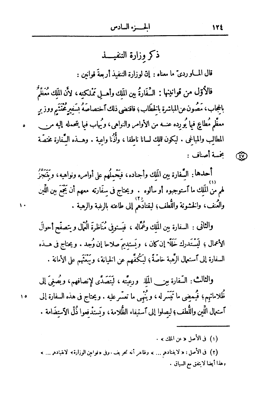 فالأوّل من قوانينها: السّفارة بين الملك وأهل مملكته، لأن الملك معظّم بالحجاب، مصون عن المباشرة بالخطاب؛ فاقتضى ذلك اختصاصه بسفير محتشم ووزير معظّم مطاع فيما يورده عنه من الأوامر والنواهى، ويهاب فيما يتحمله إليه من المطالب والمباغى. ليكون للملك لسانا ناطقا، وأذنا واعية. وهذه السّفارة مختصّة بخمسة أصناف: