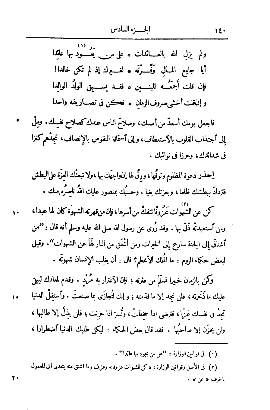[2] فى الأصل وقوانين الوزارة: «كن للشهوات عزوفا» وعزف وما اشتق منه يتعدى الى المعمول بالحرف «عن» .