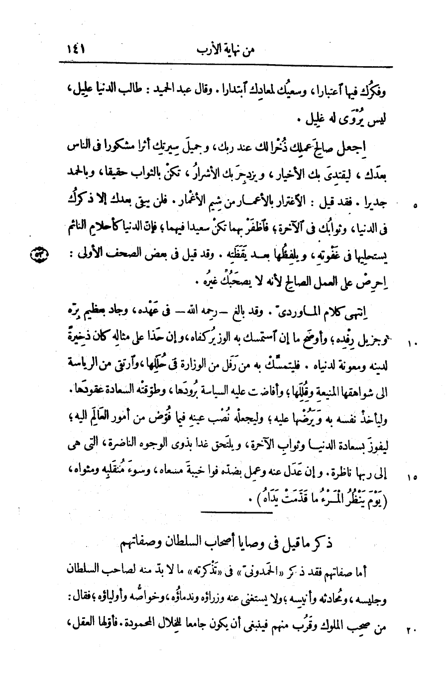 اجعل صالح عملك ذخرا لك عند ربك، وجميل سيرتك أثرا مشكورا فى الناس بعدك، ليقتدى بك الأخيار، ويزدجر بك الأشرار، تكن بالثواب حقيقا، وبالحمد جديرا. فقد قيل: الاغترار بالأعمار من شيم الأغمار. فلن يبقى بعدك إلا ذكرك فى الدنيا، وثوابك فى الآخرة؛ فاظفر بهما تكن سعيدا فيهما؛ فإنّ الدنيا كأحلام النائم يستحليها فى غفوته، ويلفظها بعد يقظته. وقد قيل فى بعض الصحف الأولى: