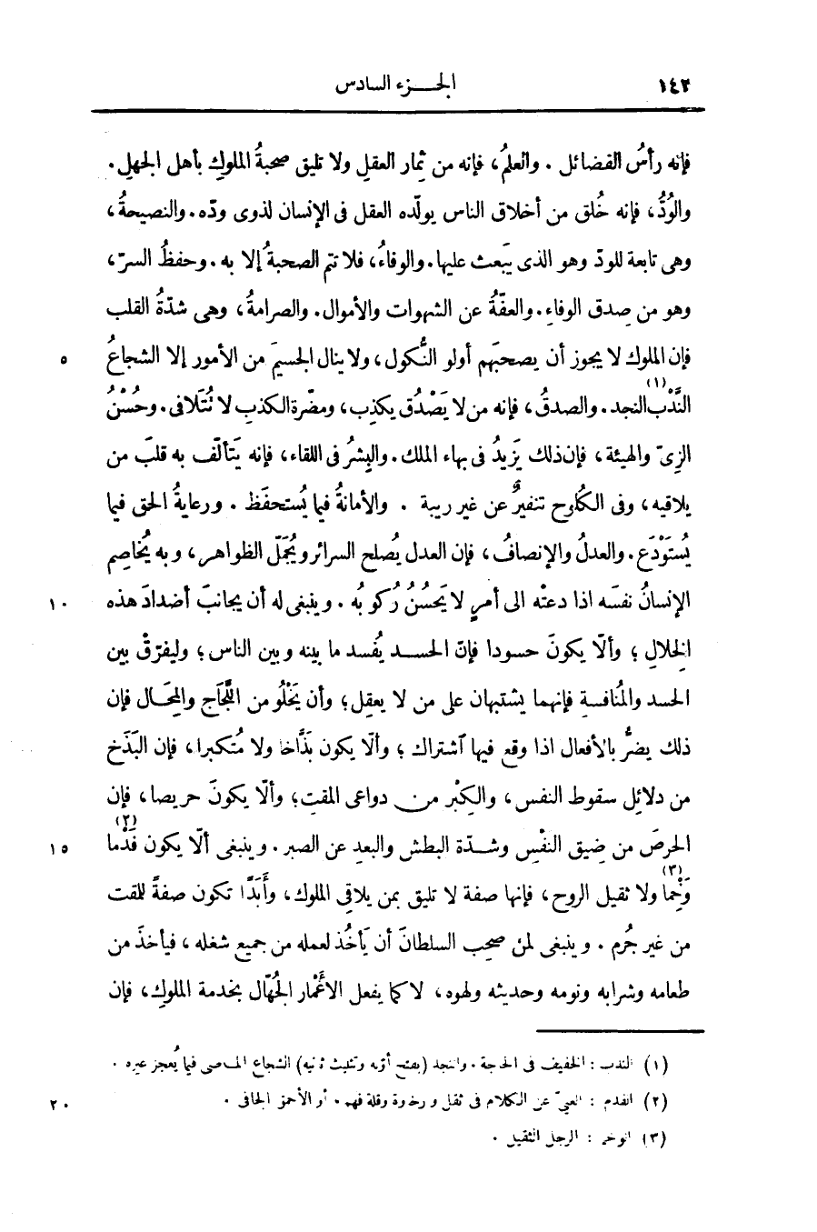 والودّ، فإنه خلق من أخلاق الناس يولّده العقل فى الإنسان لذوى ودّه. والنصيحة، وهى تابعة للودّ وهو الذى يبعث عليها. والوفاء، فلا تتم الصحبة إلا به. وحفظ السرّ، وهو من صدق الوفاء. والعفّة عن الشهوات والأموال. والصرامة، وهى شدّة القلب فإن الملوك لا يجوز أن يصحبهم أولو النّكول، ولا ينال الجسيم من الأمور إلا الشجاع النّدب [1] النجد. والصدق، فإنه من لا يصدق يكذب، ومضّرة الكذب لا تتلافى. وحسن الزىّ والهيئة، فإن ذلك يزيد فى بهاء الملك. والبشر فى اللقاء، فإنه يتألّف به قلب من يلاقيه، وفى الكلوح تنفير عن غير ريبة. والأمانة فيما يستحفظ. ورعاية الحق فيما يستودع. والعدل والإنصاف، فإن العدل يصلح السرائر ويجمّل الظواهر، وبه يخاصم الإنسان نفسه اذا دعته الى أمر لا يحسن ركوبه. وينبغى له أن يجانب أضداد هذه الخلال؛ وألّا يكون حسودا فإنّ الحسد يفسد ما بينه وبين الناس؛ وليفرّق بين الحسد والمنافسة فإنهما يشتبهان على من لا يعقل؛ وأن يخلو من اللّجاج والمحال فإن ذلك يضرّ بالأفعال اذا وقع فيها اشتراك؛ وألّا يكون بذّاخا ولا متكبرا، فإن البذخ من دلائل سقوط النفس، والكبر من دواعى المقت؛ وألّا يكون حريصا، فإن الحرص من ضيق النفس وشدّة البطش والبعد عن الصبر. وينبغى ألّا يكون فدما [2] وخما [3] ولا ثقيل الروح، فإنها صفة لا تليق بمن يلاقى الملوك، وأبدا تكون صفة للمقت من غير جرم. وينبغى لمن صحب السلطان أن يأخذ لعمله من جميع شغله، فيأخذ من طعامه وشرابه ونومه وحديثه ولهوه، لا كما يفعل الأعمار الجهّال بخدمة الملوك، فإن