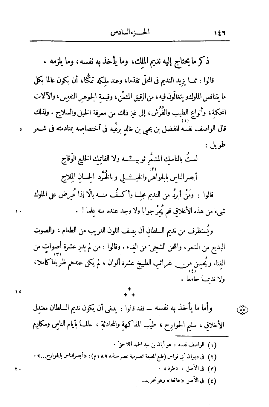 وأما ما يأخذ به نفسه- فقد قالوا: ينبغى أن يكون نديم السلطان معتدل الأخلاق، سليم الجوارح، طيّب المفاكهة والمحادثة، عالما بأيام الناس ومكارم