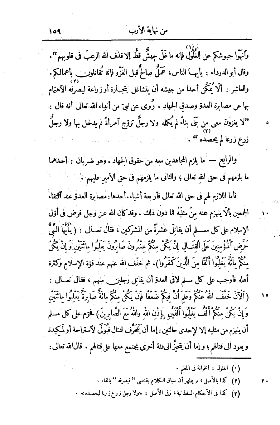 فأما اللازم لهم فى حق الله تعالى فأربعة أشياء. أحدها: مصابرة العدوّ عند التقاء الجمعين بألّا ينهزم عنه من مثليه فما دون ذلك. وقد كان الله عز وجل فرض فى أوّل الإسلام على كل مسلم أن يقاتل عشرة من المشركين، فقال تعالى: يا أَيُّهَا النَّبِيُّ حَرِّضِ الْمُؤْمِنِينَ عَلَى الْقِتالِ إِنْ يَكُنْ مِنْكُمْ عِشْرُونَ صابِرُونَ يَغْلِبُوا مِائَتَيْنِ وَإِنْ يَكُنْ مِنْكُمْ مِائَةٌ يَغْلِبُوا أَلْفاً مِنَ الَّذِينَ كَفَرُوا