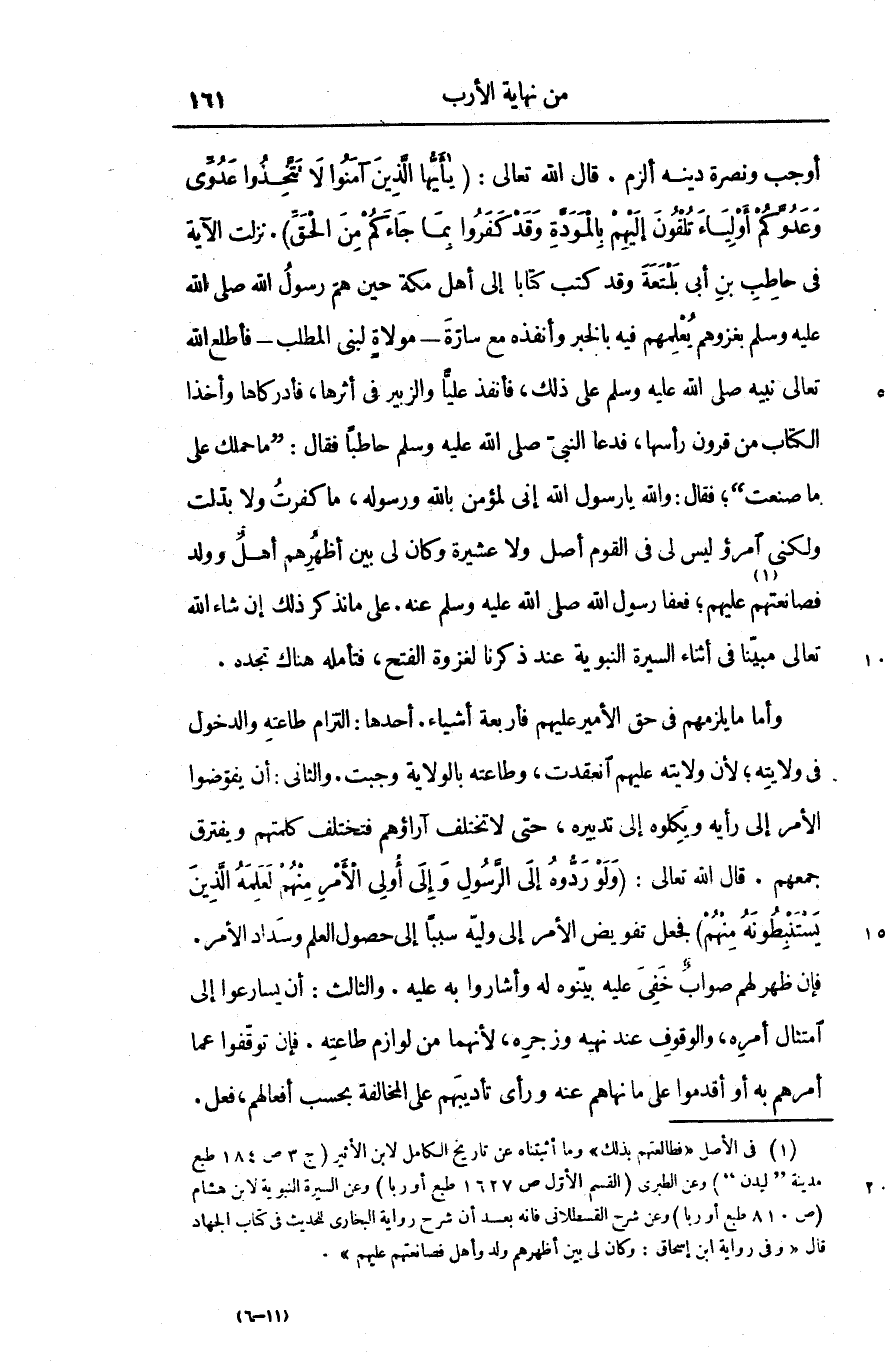وأما ما يلزمهم فى حق الأمير عليهم فأربعة أشياء. أحدها: التزام طاعته والدخول فى ولايته؛ لأن ولايته عليهم انعقدت، وطاعته بالولاية وجبت. والثانى: أن يفوّضوا الأمر إلى رأيه ويكلوه إلى تدبيره، حتى لا تختلف آراؤهم فتختلف كلمتهم ويفترق جمعهم. قال الله تعالى: وَلَوْ رَدُّوهُ إِلَى الرَّسُولِ وَإِلى أُولِي الْأَمْرِ مِنْهُمْ لَعَلِمَهُ الَّذِينَ يَسْتَنْبِطُونَهُ مِنْهُمْ