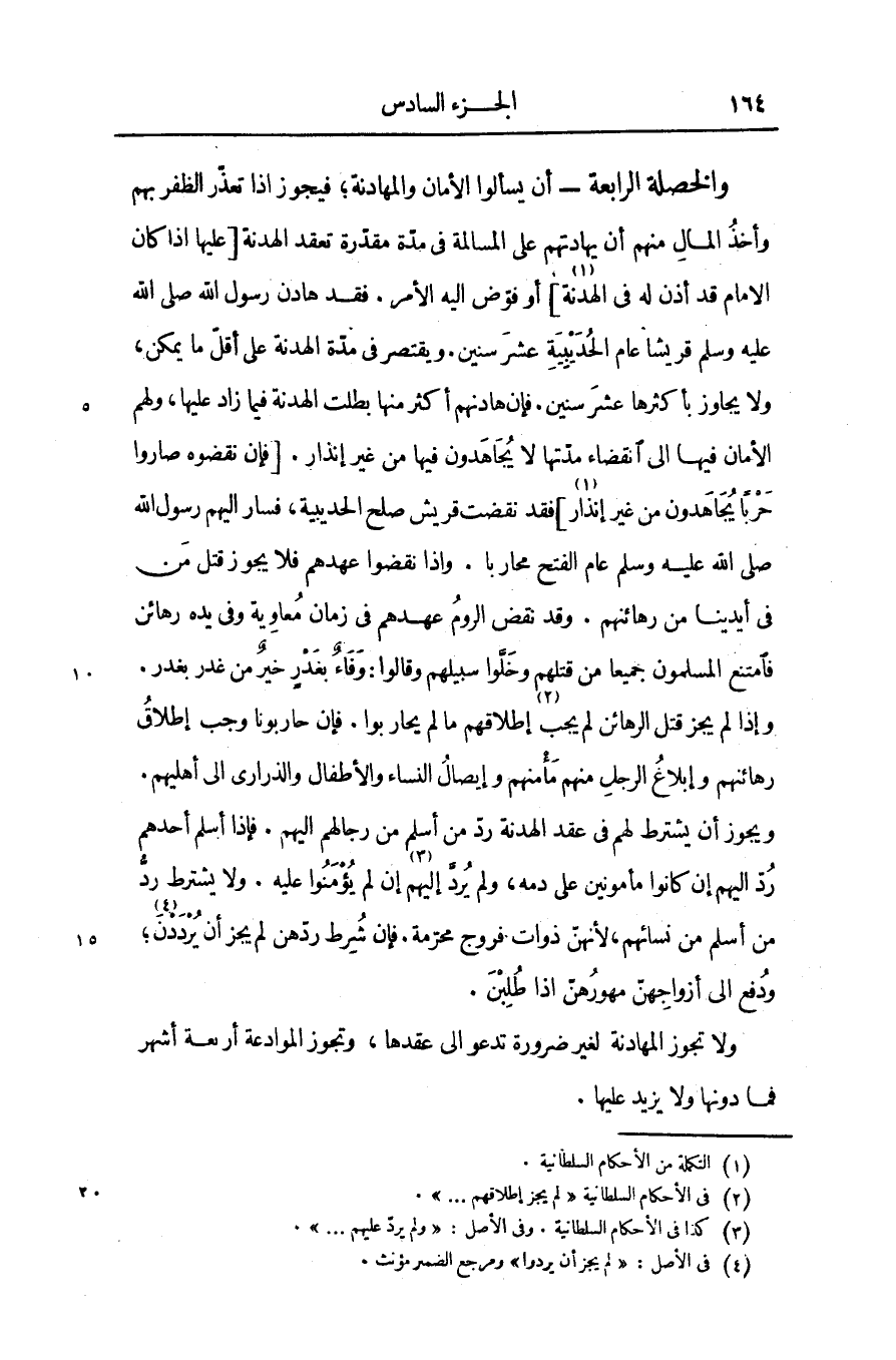 والخصلة الرابعة- أن يسألوا الأمان والمهادنة؛ فيجوز اذا تعذّر الظفر بهم وأخذ المال منهم أن يهادتهم على المسالمة فى مدّة مقدّرة تعقد الهدنة [عليها اذا كان الامام قد أذن له فى الهدنة [1]] أو فوّض اليه الأمر. فقد هادن رسول الله صلى الله عليه وسلم قريشا عام الحديبية عشر سنين. ويقتصر فى مدّة الهدنة على أقلّ ما يمكن، ولا يجاوز بأكثرها عشر سنين. فإن هادنهم أكثر منها بطلت الهدنة فيما زاد عليها، ولهم الأمان فيها الى انقضاء مدّتها لا يجاهدون فيها من غير إنذار. [فإن نقضوه صاروا حربا يجاهدون من غير إنذار [1]] فقد نقضت قريش صلح الحديبية، فسار اليهم رسول الله صلى الله عليه وسلم عام الفتح محاربا. واذا نقضوا عهدهم فلا يجوز قتل من فى أيدينا من رهائنهم. وقد نقض الروم عهدهم فى زمان معاوية وفى يده رهائن فامتنع المسلمون جميعا من قتلهم وخلّوا سبيلهم وقالوا: وفاء بغدر خير من غدر بغدر.