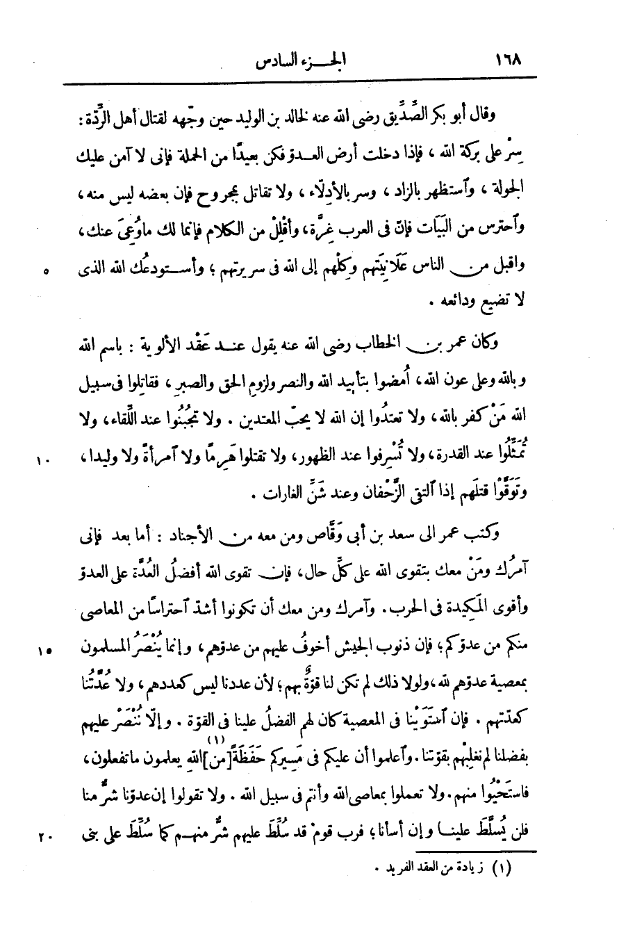 وكتب عمر الى سعد بن أبى وقّاص ومن معه من الأجناد: أما بعد فإنى آمرك ومن معك بتقوى الله على كلّ حال، فإن تقوى الله أفضل العدّة على العدوّ وأقوى المكيدة فى الحرب. وآمرك ومن معك أن تكونوا أشدّ احتراسا من المعاصى منكم من عدوّكم؛ فإن ذنوب الجيش أخوف عليهم من عدوّهم، وإنما ينصر المسلمون بمعصية عدوّهم لله، ولولا ذلك لم تكن لنا قوّة بهم؛ لأن عددنا ليس كعددهم، ولا عدّتنا كعدّتهم. فإن استوينا فى المعصية كان لهم الفضل علينا فى القوّة. وإلّا ننصر عليهم بفضلنا لم نغلبهم بقوّتنا. واعلموا أن عليكم فى مسيركم حفظة [من [1]] الله يعلمون ما تفعلون، فاستحيوا منهم. ولا تعملوا بمعاصى الله وأنتم فى سبيل الله. ولا تقولوا إن عدوّنا شرّ منا فلن يسلّط علينا وإن أسأنا؛ فرب قوم قد سلّط عليهم شرّ منهم كما سلّط على بنى
