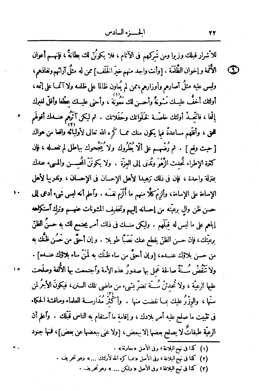 ولا تنقض سنّة صالحة عمل بها صدور هذه الأمة واجتمعت بها الألفة وصلحت عليها الرعيّة، ولا تحدثنّ سنّة تضرّ بشىء من ماضى تلك السنن، فيكون الأجر لمن سنّها، والوزر عليك بما نقضت منها. وأكثر [3] مدارسة العلماء ومناقشة الحكماء فى تثبيت ما صلح عليه أمر بلادك، وإقامة ما استقام به الناس قبلك. واعلم أنّ الرعيّة طبقات لا يصلح بعضها إلا ببعض، [ولا غنى ببعضها عن بعض] ، فمنها جنود