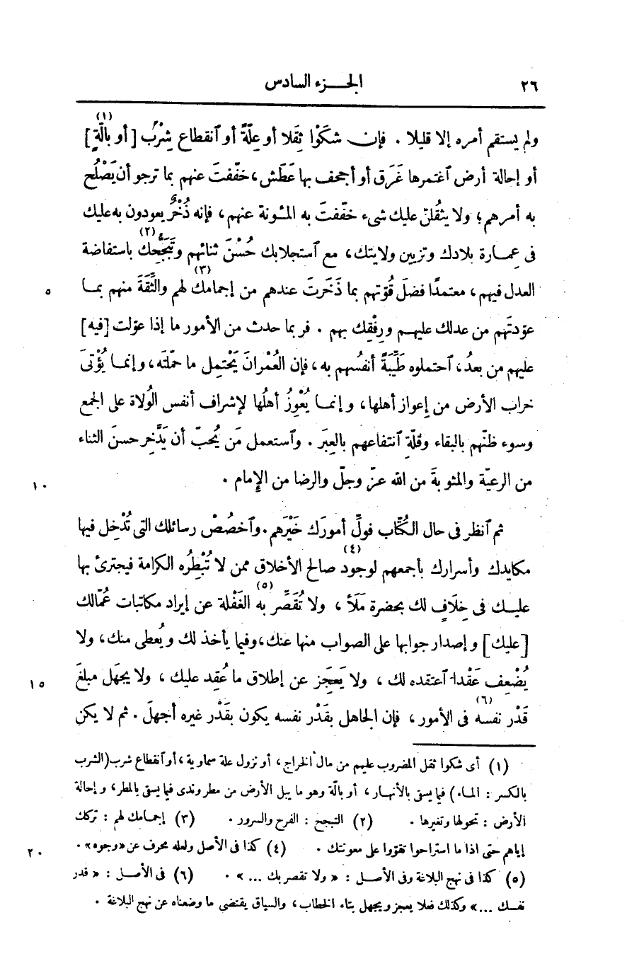 ولم يستقم أمره إلا قليلا. فإن شكوا ثقلا أو علّة أو انقطاع شرب [أو بالّة [1]] أو إحالة أرض اغتمرها غرق أو أجحف بها عطش، خفّفت عنهم بما ترجو أن يصلح به أمرهم؛ ولا يثقلنّ عليك شىء خفّفت به المؤنة عنهم، فإنه ذخر يعودون به عليك فى عمارة بلادك وتزيين ولايتك، مع استجلابك حسن ثنائهم وتبجّحك [2] باستفاضة العدل فيهم، معتمدا فضل قوّتهم بما ذخرت عندهم من إجمامك [3] لهم والثّقة منهم بما عوّدتهم من عدلك عليهم ورفقك بهم. فربما حدث من الأمور ما إذا عوّلت [فيه] عليهم من بعد، احتملوه طيّبة أنفسهم به، فإن العمران يحتمل ما حمّلته، وإنما يؤتى خراب الأرض من إعواز أهلها، وإنما يعوز أهلها لإشراف أنفس الولاة على الجمع وسوء ظنّهم بالبقاء وقلّة انتفاعهم بالعبر. واستعمل من يحبّ أن يدّخر حسن الثناء من الرعيّة والمثوبة من الله عزّ وجلّ والرضا من الإمام.