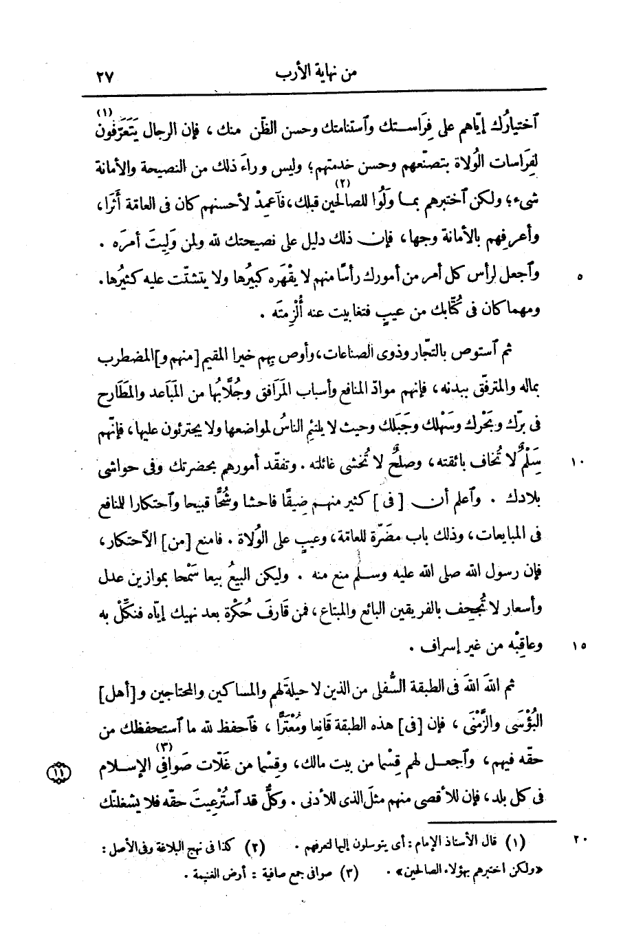 ثم استوص بالتجّار وذوى الصناعات، وأوص بهم خيرا المقيم [منهم و] المضطرب بماله والمترفّق ببدنه، فإنهم موادّ المنافع وأسباب المرافق وجلّابها من المباعد والمطارح فى برّك وبحرك وسهلك وجبلك وحيث لا يلتئم الناس لمواضعها ولا يجترئون عليها، فإنّهم سلم لا تخاف بائقته، وصلح لا تخشى غائلته. وتفقّد أمورهم بحضرتك وفى حواشى بلادك. واعلم أن [فى] كثير منهم ضيقا فاحشا وشحّا قبيحا واحتكارا للمنافع فى المبايعات، وذلك باب مضرّة للعامّة، وعيب على الولاة. فامنع [من] الاحتكار، فإن رسول الله صلى الله عليه وسلم منع منه. وليكن البيع بيعا سمحا بموازين عدل وأسعار لا تجحف بالفريقين البائع والمبتاع، فمن قارف حكرة بعد نهيك إيّاه فنكّل به وعاقبه من غير إسراف.