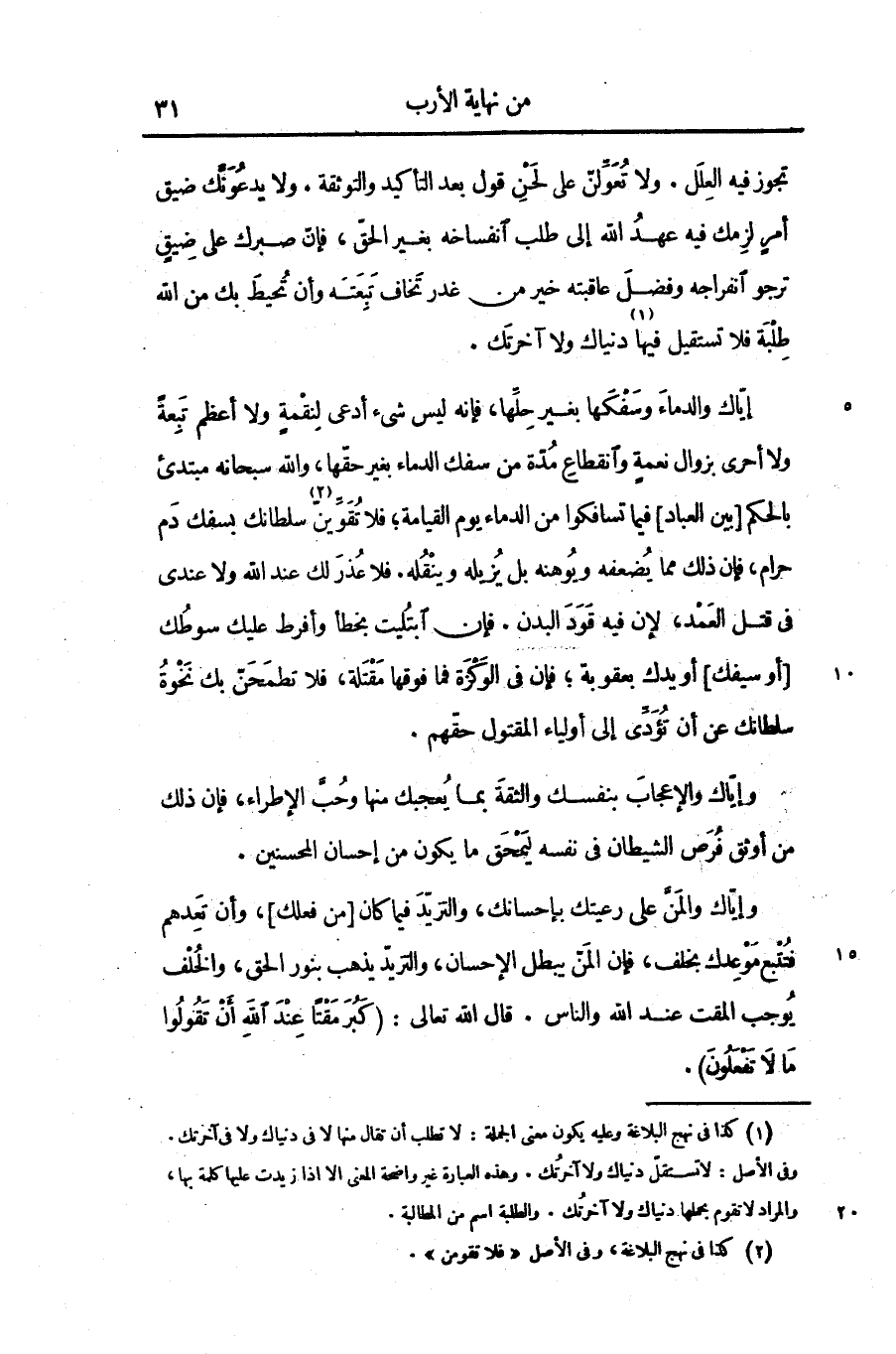 إيّاك والدماء وسفكها بغير حلّها، فإنه ليس شىء أدعى لنقمة ولا أعظم تبعة ولا أحرى بزوال نعمة وانقطاع مدّة من سفك الدماء بغير حقّها، والله سبحانه مبتدئ بالحكم [بين العباد] فيما تسافكوا من الدماء يوم القيامة؛ فلا تقوّينّ [2] سلطانك بسفك دم حرام، فإن ذلك مما يضعفه ويوهنه بل يزيله وينقله. فلا عذر لك عند الله ولا عندى فى قتل العمد، لإن فيه قود البدن. فإن ابتليت بخطأ وأفرط عليك سوطك [أو سيفك] أو يدك بعقوبة؛ فإن فى الوكزة فما فوقها مقتلة، فلا تطمحنّ بك نخوة سلطانك عن أن تؤدّى إلى أولياء المقتول حقّهم.