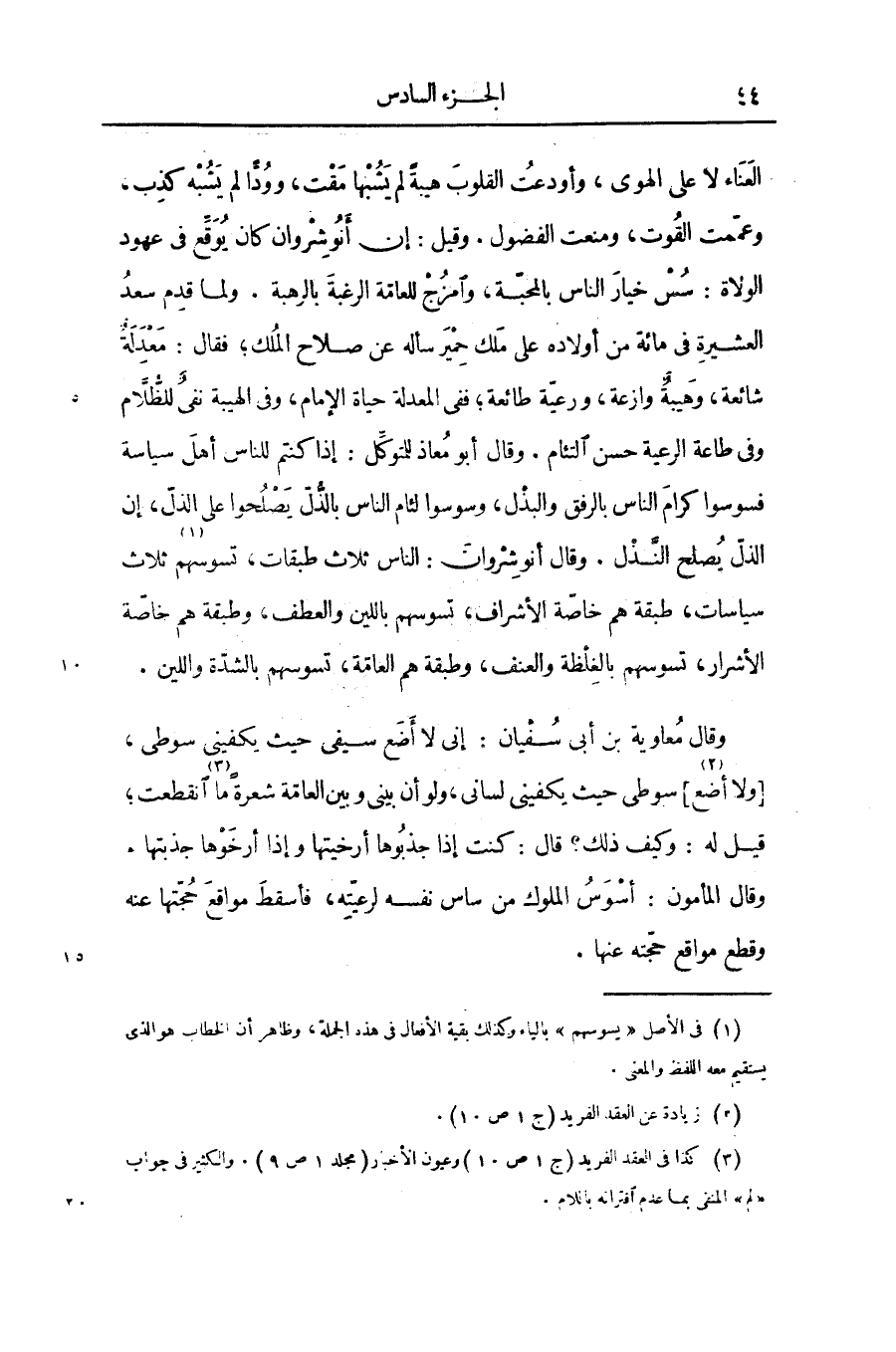 العناء لا على الهوى، وأودعت القلوب هيبة لم يشبها مقت، وودّا لم يشبه كذب، وعمّمت القوت، ومنعت الفضول. وقيل: إن أنوشروان كان يوقّع فى عهود الولاة: سس خيار الناس بالمحبّة، وامزج للعامّة الرغبة بالرهبة. ولما قدم سعد العشيرة فى مائة من أولاده على ملك حمير سأله عن صلاح الملك؛ فقال: معدلة شائعة، وهيبة وازعة، ورعيّة طائعة؛ ففى المعدلة حياة الإمام، وفى الهيبة نفى للظّلّام وفى طاعة الرعية حسن التئام. وقال أبو معاذ للمتوكّل: إذا كنتم للناس أهل سياسة فسوسوا كرام الناس بالرفق والبذل، وسوسوا لئام الناس بالذّلّ يصلحوا على الذلّ، إن الذلّ يصلح النّذل. وقال أنوشروان: الناس ثلاث طبقات، تسوسهم [1] ثلاث سياسات، طبقة هم خاصّة الأشراف، تسوسهم باللين والعطف، وطبقة هم خاصّة الأشرار، تسوسهم بالغلظة والعنف، وطبقة هم العامّة، تسوسهم بالشدّة واللين.