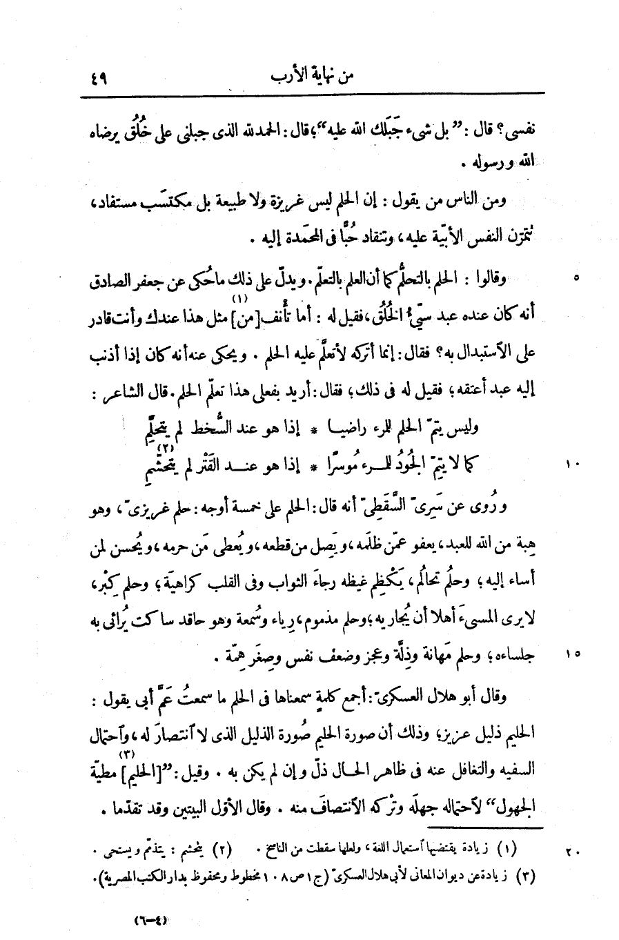 وقالوا: الحلم بالتحلّم كما أن العلم بالتعلّم. ويدلّ على ذلك ما حكى عن جعفر الصادق أنه كان عنده عبد سيّئ الخلق، فقيل له: أما تأنف [من [1]] مثل هذا عندك وأنت قادر على الاستبدال به؟ فقال: إنما أتركه لأتعلّم عليه الحلم. ويحكى عنه أنه كان إذا أذنب إليه عبد أعتقه؛ فقيل له فى ذلك؛ فقال: أريد بفعلى هذا تعلّم الحلم. قال الشاعر: