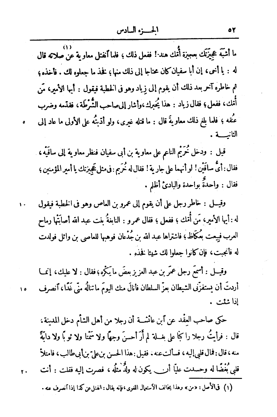 ما أشبه عجيزتك بعجيزة أمّك هند! ففعل ذلك؛ فلما انفتل معاوية عن [1] صلاته قال له: يا أخى، إن أبا سفيان كان محتاجا إلى ذلك منها؛ فخذ ما جعلوه لك. فأخذه؛ ثم خاطره آخر بعد ذلك أن يقوم إلى زياد وهو فى الخطبة فيقول: أيها الأمير، من أمّك، ففعل؛ فقال زياد: هذا يخبرك، وأشار إلى صاحب الشّرطة، فقدّمه وضرب عنقه؛ فلما بلغ ذلك معاوية قال: ما قتله غيرى، ولو أدّبته على الأولى ما عاد إلى الثانية.