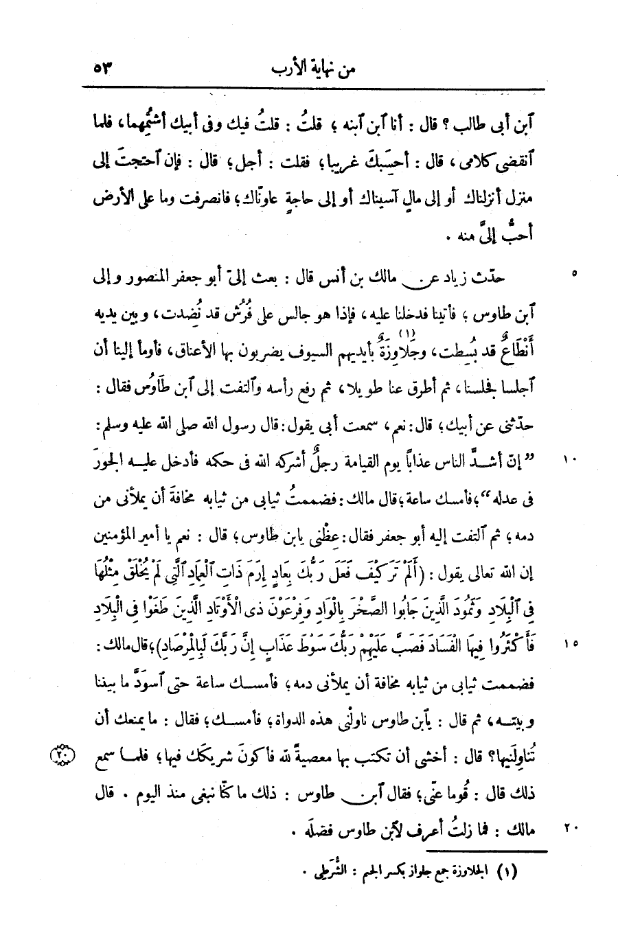؛ فأمسك ساعة؛ قال مالك: فضممت ثيابى من ثيابه مخافة أن يملأنى من دمه؛ ثم التفت إليه أبو جعفر فقال: عظنى يابن طاوس؛ قال: نعم يا أمير المؤمنين إن الله تعالى يقول: أَلَمْ تَرَ كَيْفَ فَعَلَ رَبُّكَ بِعادٍ إِرَمَ ذاتِ الْعِمادِ الَّتِي لَمْ يُخْلَقْ مِثْلُها فِي الْبِلادِ وَثَمُودَ الَّذِينَ جابُوا الصَّخْرَ بِالْوادِ وَفِرْعَوْنَ ذِي الْأَوْتادِ الَّذِينَ طَغَوْا فِي الْبِلادِ فَأَكْثَرُوا فِيهَا الْفَسادَ فَصَبَّ عَلَيْهِمْ رَبُّكَ سَوْطَ عَذابٍ إِنَّ رَبَّكَ لَبِالْمِرْصادِ