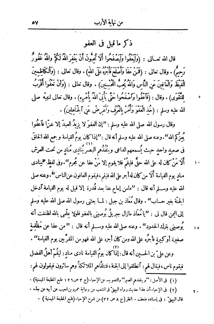 . وقال معاذ بن جبل: لما بعثنى رسول الله صلى الله عليه وسلم إلى اليمن قال لى: «يا معاذ ما زال جبريل يوصينى بالعفو فلولا علمى بالله لظننت أنه يوصينى بترك الحدود»