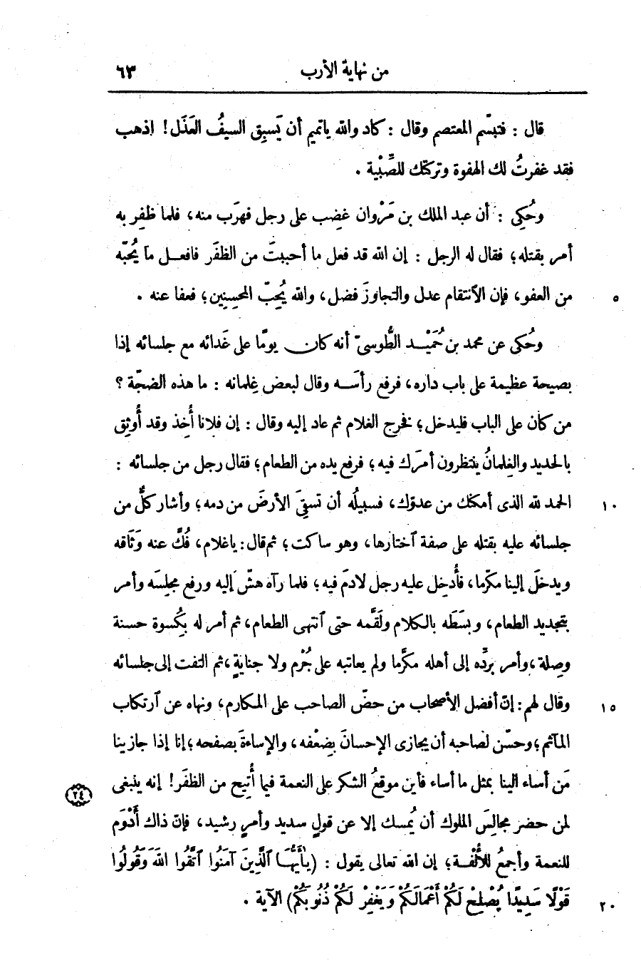 الحمد لله الذى أمكنك من عدوّك، فسبيله أن تسقى الأرض من دمه؛ وأشار كلّ من جلسائه عليه بقتله على صفة اختارها، وهو ساكت؛ ثم قال: يا غلام، فكّ عنه وثاقه ويدخل إلينا مكرّما، فأدخل عليه رجل لادم فيه؛ فلما رآه هشّ إليه ورفع مجلسه وأمر بتجديد الطعام، وبسطه بالكلام ولقّمه حتى انتهى الطعام، ثم أمر له بكسوة حسنة وصلة، وأمر بردّه إلى أهله مكرّما ولم يعاتبه على جرم ولا جناية، ثم التفت إلى جلسائه وقال لهم: إنّ أفضل الأصحاب من حضّ الصاحب على المكارم، ونهاه عن ارتكاب المآثم؛ وحسّن لصاحبه أن يجازى الإحسان بضعفه، والإساءة بصفحه؛ إنا إذا جازينا من أساء الينا بمثل ما أساء فأين موقع الشكر على النعمة فيما أتيح من الظفر! إنه ينبغى لمن حضر مجالس الملوك أن يمسك إلا عن قول سديد وأمر رشيد، فإنّ ذاك أدوم للنعمة وأجمع للألفة؛ إن الله تعالى يقول: يا أَيُّهَا الَّذِينَ آمَنُوا اتَّقُوا اللَّهَ وَقُولُوا قَوْلًا سَدِيداً يُصْلِحْ لَكُمْ أَعْمالَكُمْ وَيَغْفِرْ لَكُمْ ذُنُوبَكُمْ