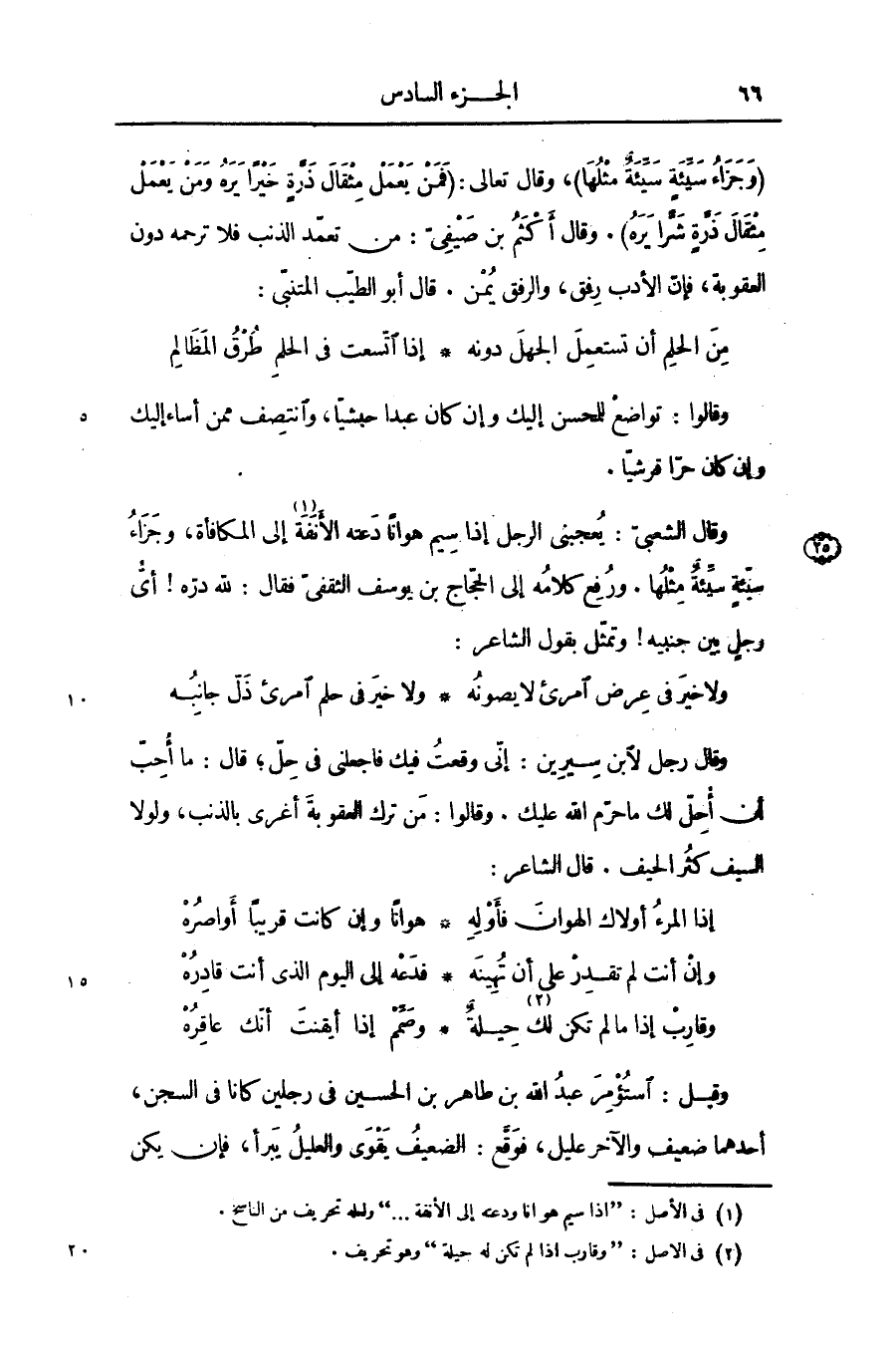 وقال الشعبىّ: يعجبنى الرجل إذا سيم هوانا دعته الأنفة [1] إلى المكافأة، وجزاء سيّئة سيّئة مثلها. ورفع كلامه إلى الحجّاج بن يوسف الثقفىّ فقال: لله درّه! أىّ رجل بين جنبيه! وتمثّل بقول الشاعر: