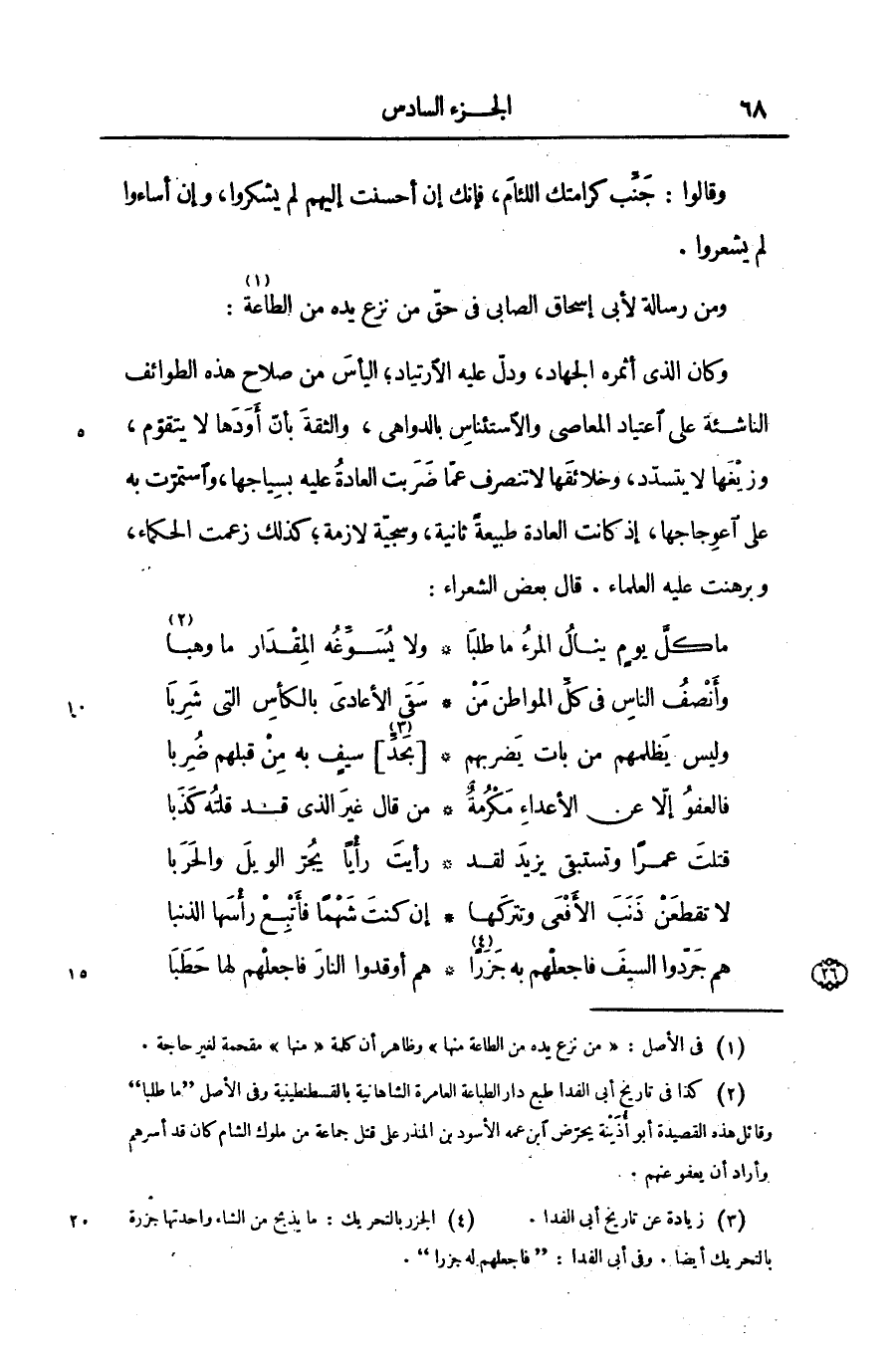 [2] كذا فى تاريخ أبى الفدا طبع دار الطباعة العامرة الشاهانية بالقسطنطينية وفى الأصل «ما طلبا» وقائل هذه القصيدة أبو أذينة يحرّض ابن عمه الأسود بن المنذر على قتل جماعة من ملوك الشام كان قد أسرهم وأراد أن يعفو عنهم.