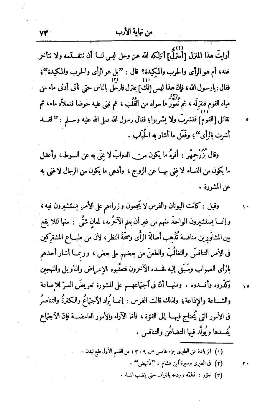 وقيل: كانت اليونان والفرس لا يجمعون وزراءهم على الأمر يستشيرون فيه، وإنما يستشيرون الواحد منهم من غير أن يعلم الآخر به، لمعان شتّى: منها لئلا يقع بين المشاورين منافسة تذهب أصالة الرأى وصحّة النظر، لأن من طباع المشتركين فى الأمر التنافس والتغالب والطعن من بعضهم على بعض، وربما أشار أحدهم بالرأى الصواب وسبق إليه فحسده الآخرون فتعقّبوه بالإعراض والتأويل والتهجين وكدّروه وأفسدوه. ومنها أنّ فى اجتماعهم على المشورة تعريض السرّ للإضاعة والشناعة والإذاعة؛ ولذلك قالت الفرس: إنما يراد الاجتماع والكثرة والتناصر فى الأمور التى يحتاج فيها إلى القوّة، فأمّا الآراء والأمور الغامضة فإنّ الاجتماع يفسدها ويولّد فيها التضاغن والتنافس.