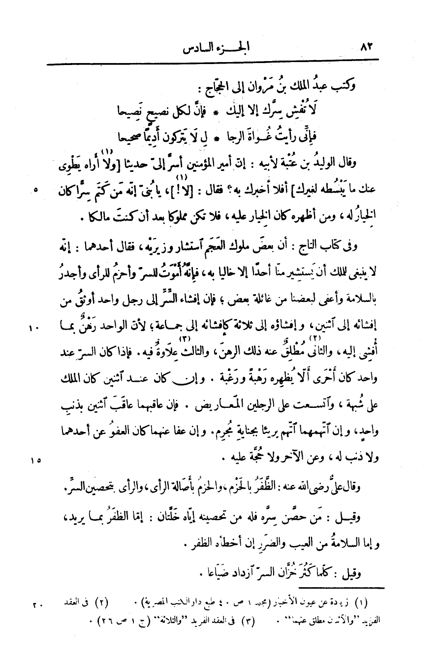 وفى كتاب التاج: أن بعض ملوك العجم استشار وزيريه، فقال أحدهما: إنّه لا ينبغى للملك أن يستشير منّا أحدا إلا خاليا به، فإنّه أموت للسرّ وأحزم للرأى وأجدر بالسلامة وأعفى لبعضنا من غائلة بعض؛ فإن إفشاء السّرّ إلى رجل واحد أوثق من إفشائه إلى اثنين، وإفشاؤه إلى ثلاثة كإفشائه إلى جماعة؛ لأنّ الواحد رهن بما أفشى إليه، والثانى [2] مطلق عنه ذلك الرهن، والثالث [3] علاوة فيه. فإذا كان السرّ عند واحد كان أحرى ألّا يظهره رهبة ورغبة. وإن كان عند اثنين كان الملك على شبهة، واتسعت على الرجلين المعاريض. فإن عاقبهما عاقب اثنين بذنب واحد، وإن اتّهمهما اتّهم بريئا بجناية مجرم. وإن عفا عنهما كان العفو عن أحدهما ولا ذنب له، وعن الآخر ولا حجّة عليه.