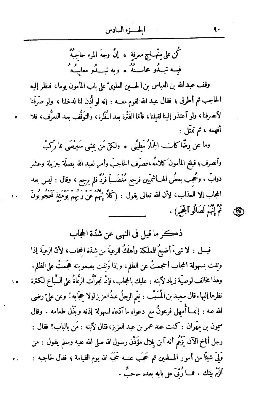 وانصرف؛ فبلغ المأمون كلامه، فصرف الحاجب وأمر لعبد الله بصلة جزيلة وعشر دوابّ. وحجب بعض الهاشميّين فرجع مغضبا فردّ فلم يرجع، وقال: ليس بعد الحجاب إلا العذاب، لأن الله تعالى يقول: كَلَّا إِنَّهُمْ عَنْ رَبِّهِمْ يَوْمَئِذٍ لَمَحْجُوبُونَ ثُمَّ إِنَّهُمْ لَصالُوا الْجَحِيمِ.