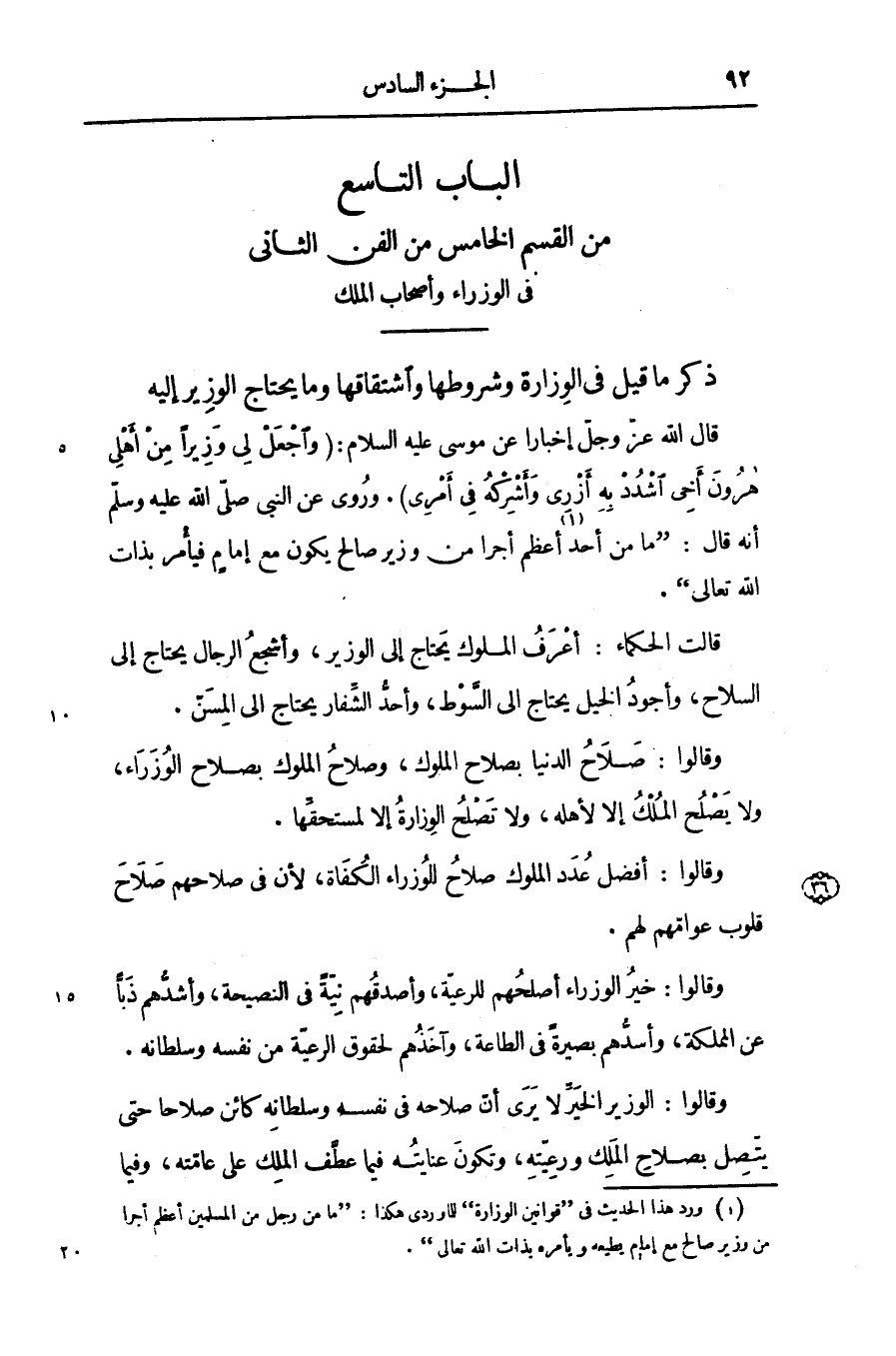 [1] ورد هذا الحديث فى «قوانين الوزارة» للماوردى هكذا: «ما من رجل من المسلمين أعظم أجرا من وزير صالح مع إمام يطيعه ويأمره بذات الله تعالى» .