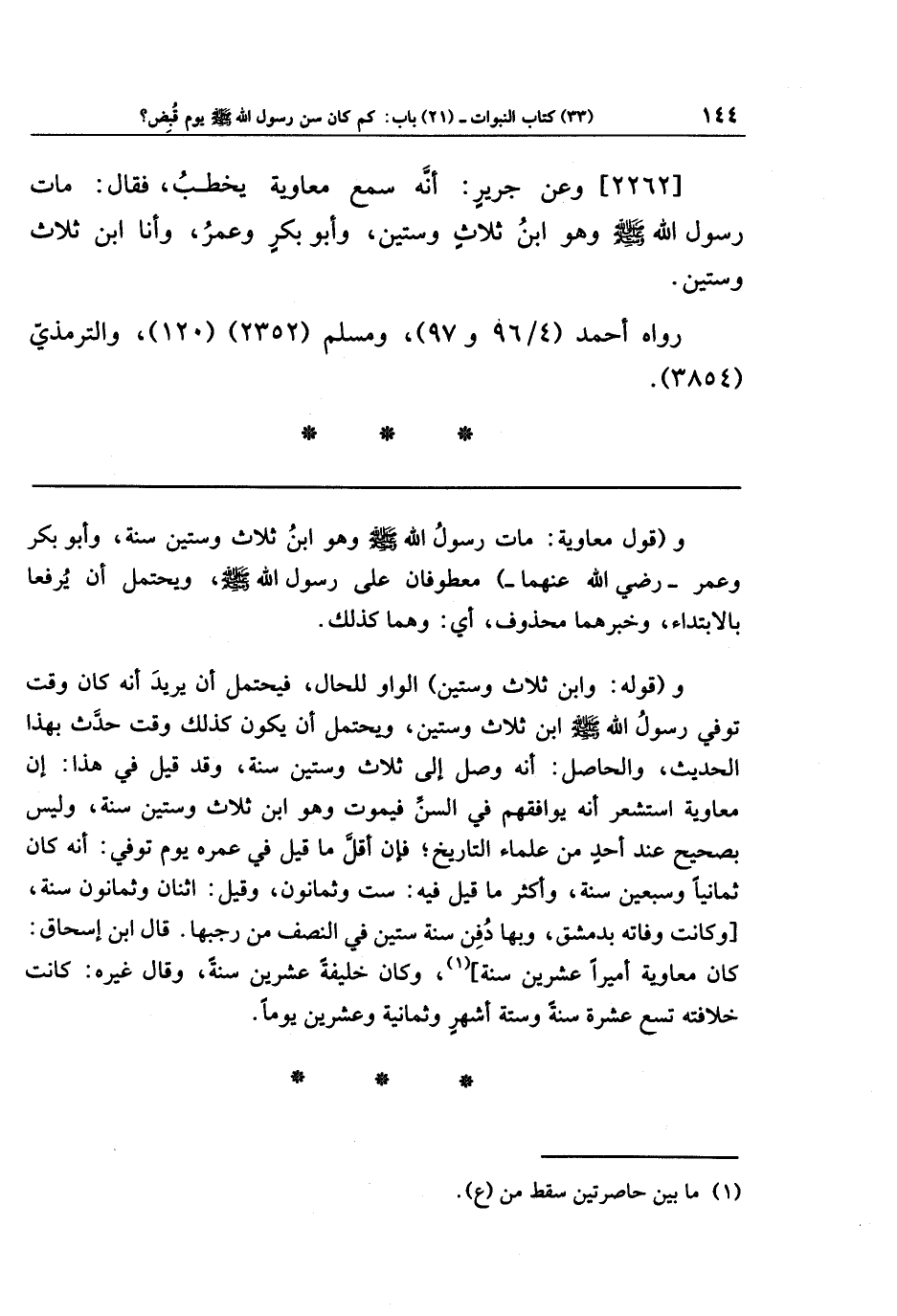 [2262] وعن جَرِيرٍ أَنَّهُ سَمِعَ مُعَاوِيَةَ يَخطُبُ فَقَالَ: مَاتَ رَسُولُ اللَّهِ صَلَّى اللَّهُ عَلَيهِ وَسَلَّمَ وَهُوَ ابنُ ثَلَاثٍ وَسِتِّينَ، وَأَبُو بَكرٍ، وَعُمَرُ وَأَنَا ابنُ ثَلَاثٍ وَسِتِّينَ.